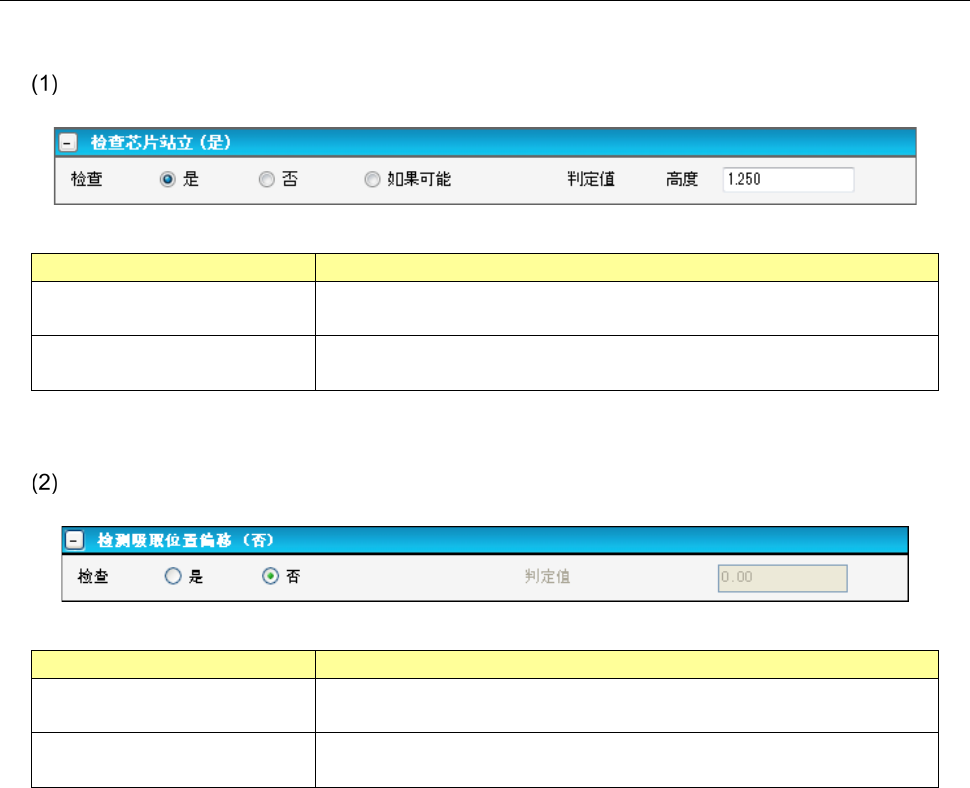 6- 56 6-2- 48 检查 检查画面,用于设置有关检查的详细信息。 检查芯片站立 项目 内容 检查芯片站立 是 / 否 / 如果可能 用单选按钮选择是否使用检查芯片站立功能。 默认值为「如果可能」 。 检查芯片站立 判定值 指定检查芯片站立选择「是」或「如果可能」时,可输入此项,判定值里输 入 “ 高度 ” 。输入范围因元件类型而异。 检测吸取位置偏移 项目 内容 检测吸取位置偏移 是 / 否 用单选按钮选择是否检测吸取位置偏移。…