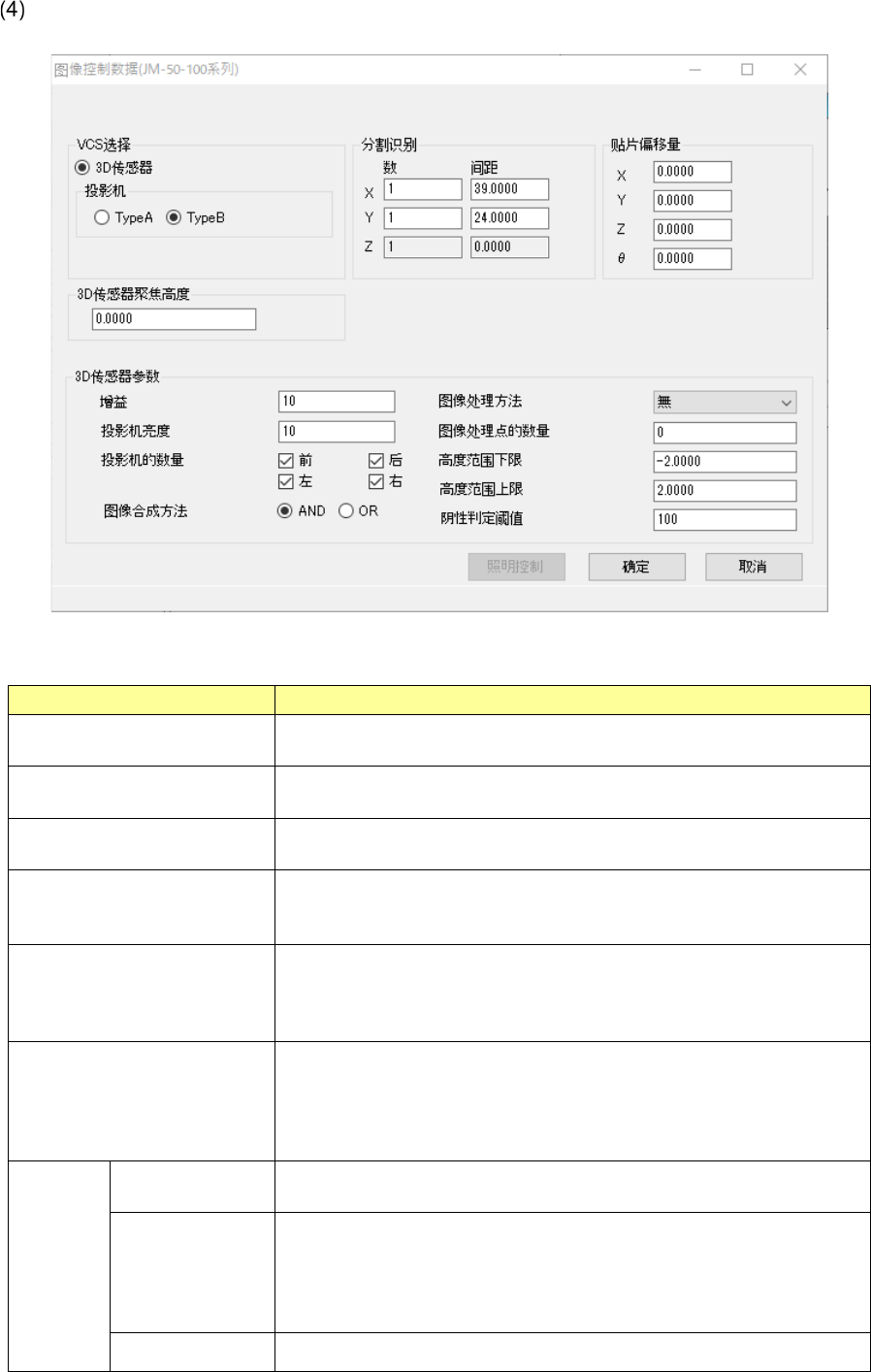 6- 74 请勾选 「前」 、 「后 」 、「 左 」 、「 右」中要使用的投影机。 ( 默认值: 全部 为 ON) 图像合成方法 选择 3D 传感器图像的合成方法。 从「 AND 」、「 OR 」中选择 ( 默认值: AND) 。 图像处理方法 选择 3D 传感器的图像处理方法。 从 「无 」 、「 OPEN 」 、「 C LOSE 」 、「 DIALATE 」 、「 ERODE 」 、「 MEDIAN FILTER 」中选择(默认值…