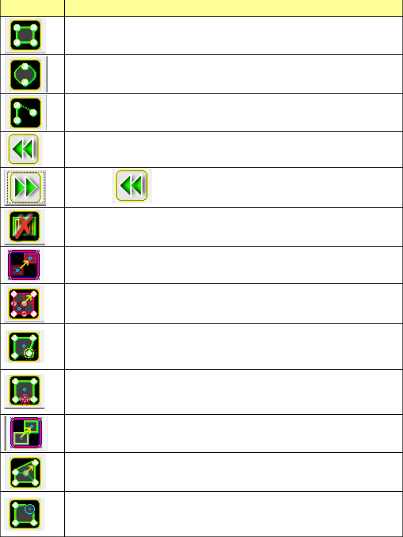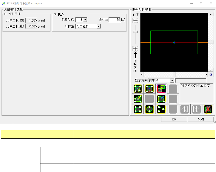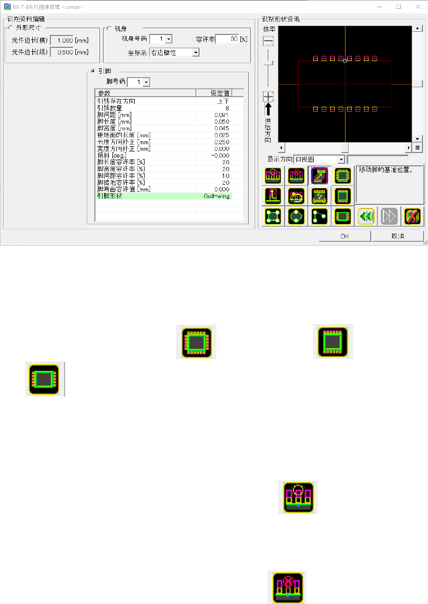 6- 107 图标 说明 新建形状为矩形的机身信息。 新建形状为圆形的机身信息。 新建仅有起始点的机身信息。 撤销当前的操作,将识别数据编辑恢复到前一个状态。 恢复按下 前的状态,重新执行操作。 删除所有引脚参数。 显示用于设定外形尺寸的元件中心的编辑标记。 蓝色标记:设定元件中心位置 调整图像分辨率。 显示添加机身顶点的编辑标记。 触摸取得的图像上的机身顶点位置 , 制作新的顶点, 或触摸边上显示的 白色标记进行边的分割。 显示用于删…