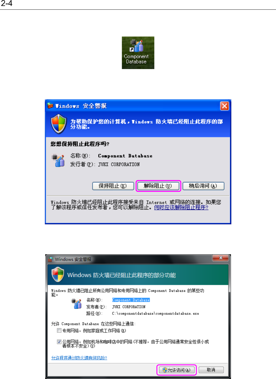 2- 15 元件数据库的首次启动 双击桌面的「 Component Databas e 」,或选择开始菜单的 [JUKI] - [Component Database] - [Com ponentDatabase] ,即可启动元件数据库。 如果 Windows 防火墙设置 为「有效」,会显示防火墙的警告画面。 请选择「解除阻止」。以后启动时,即不会显示此提示信息。 如果是 Windows7 ,会显示以下防火墙的警告画面。 请选择「容许访…