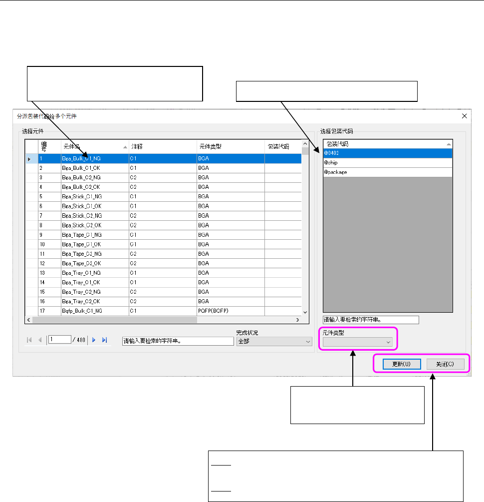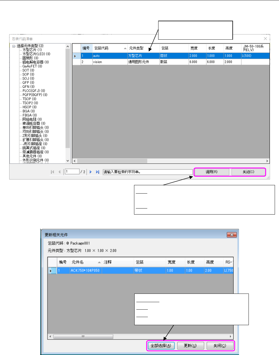通过调用包装代码,可以一览显示可使用的全部包装代码,更新数据库内具有相同包装代码的元件数据。