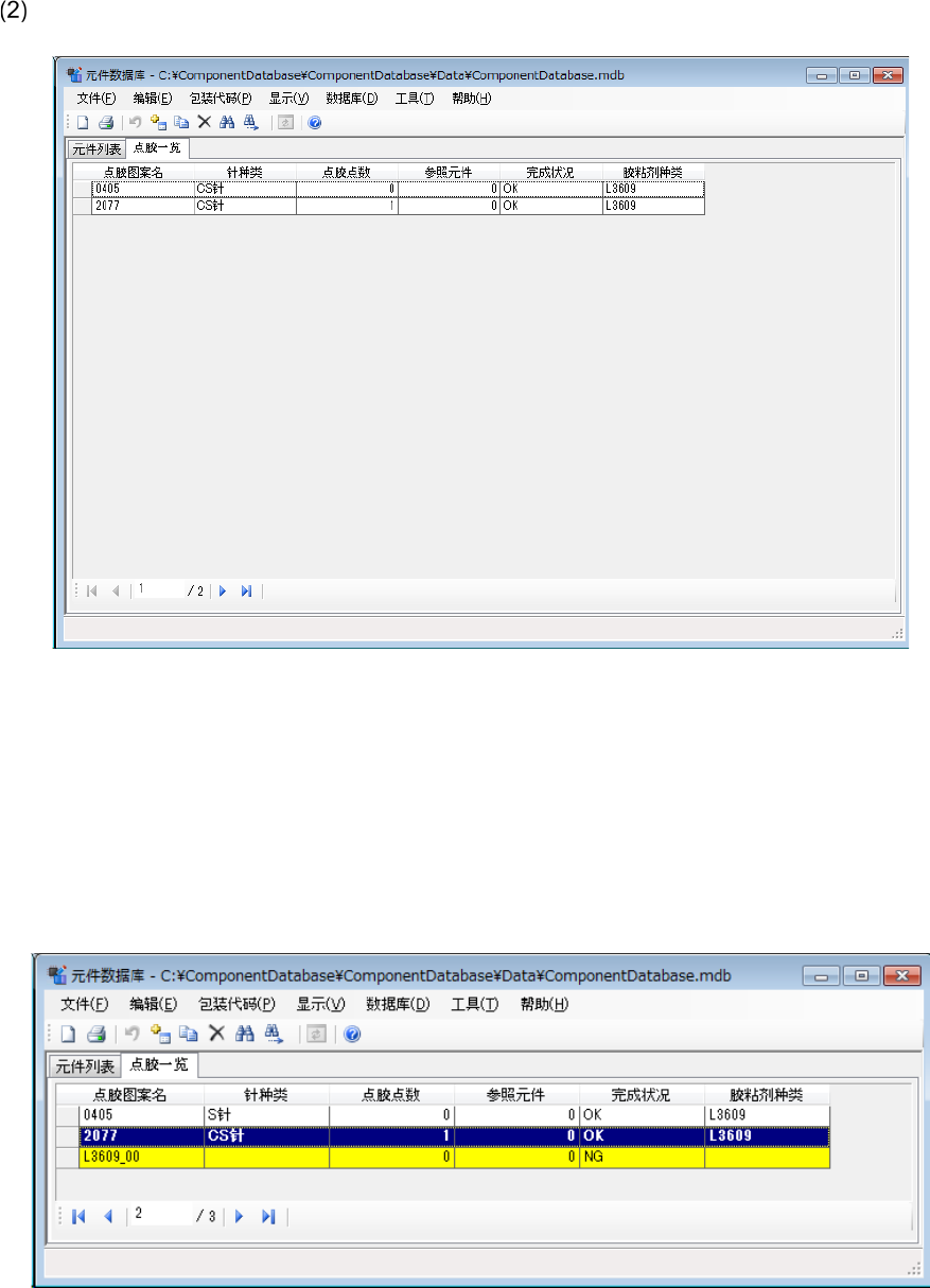 在「点胶一览」画面,制作的「点胶数据」处于未完成状态时,该元件信息的背景色以黄色显示。