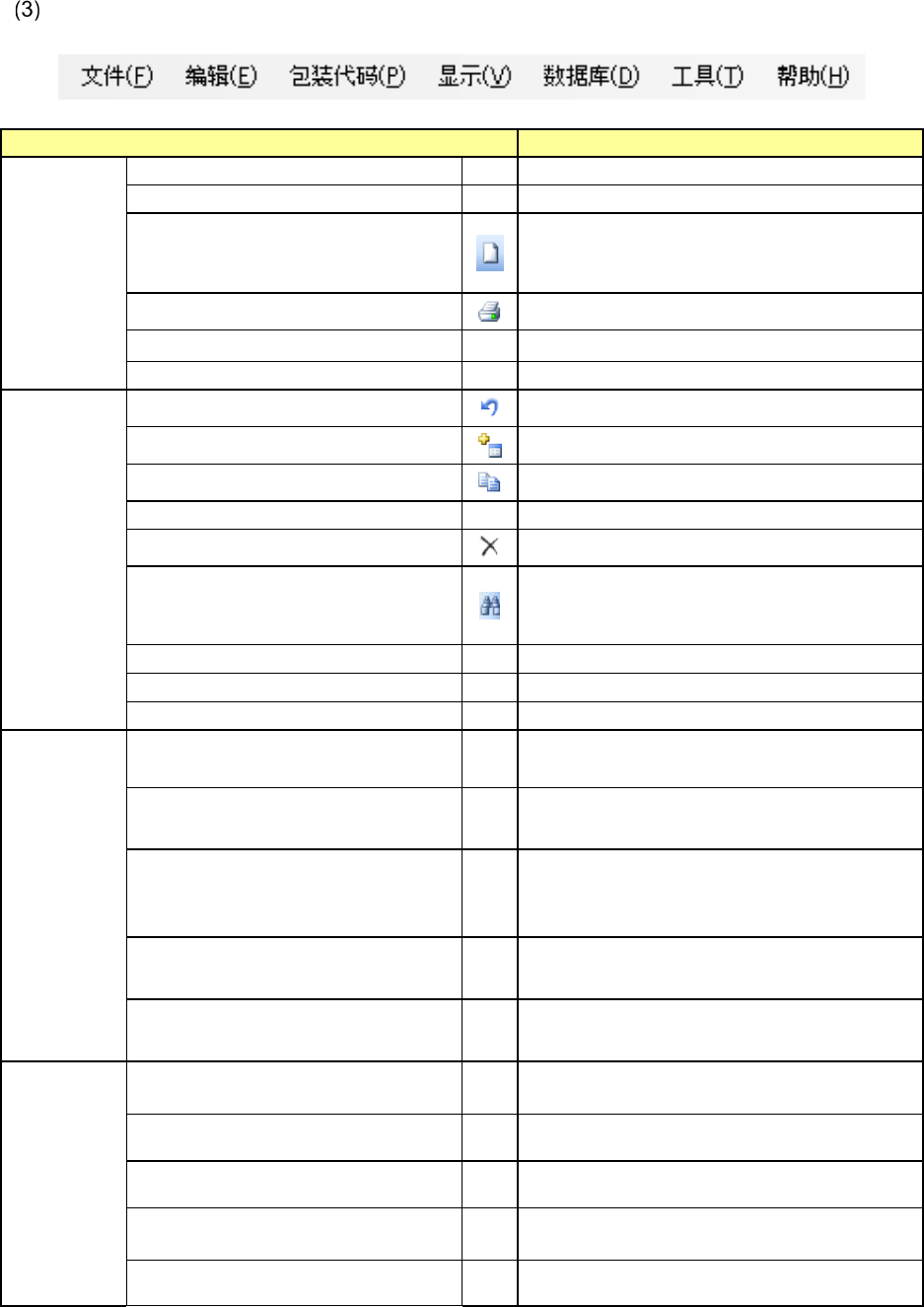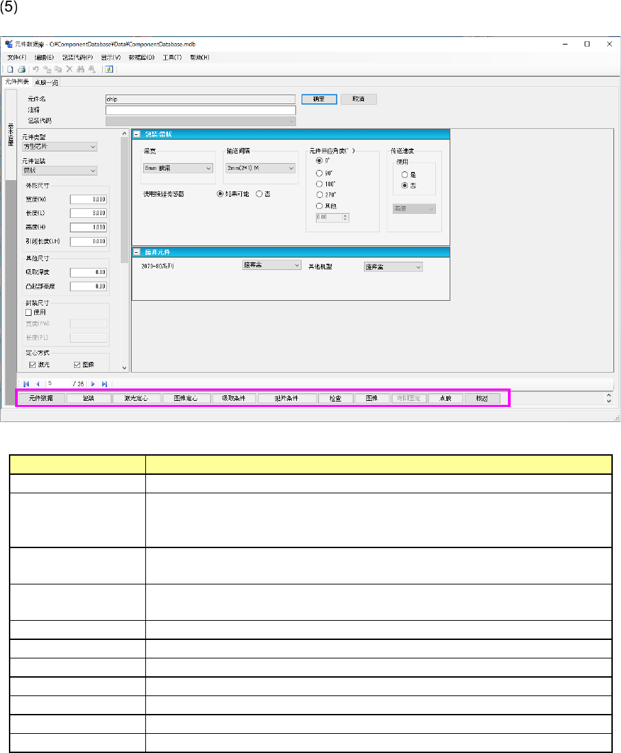3-7 菜单项目 内容 数据库 (D) 更新 ( S) 在元件数据编辑中,保存编辑中的元件数据 库。 重新调出 (I) 进行数据库的重新查找。 工具 (T) 环境设置 (E)... 进行元件数据库的环境设置。 语言转换 (L) 转换显示语言。 压缩数据库 (C ) 压缩 MDB 。 帮助 (H) 版本信息 (A) 显示数据库的版本。 工具栏 工具栏项目 内容 取得外部数据 ( 导入 ) 取得生产程序、 其他公司元件库、 第三方提供的元件…