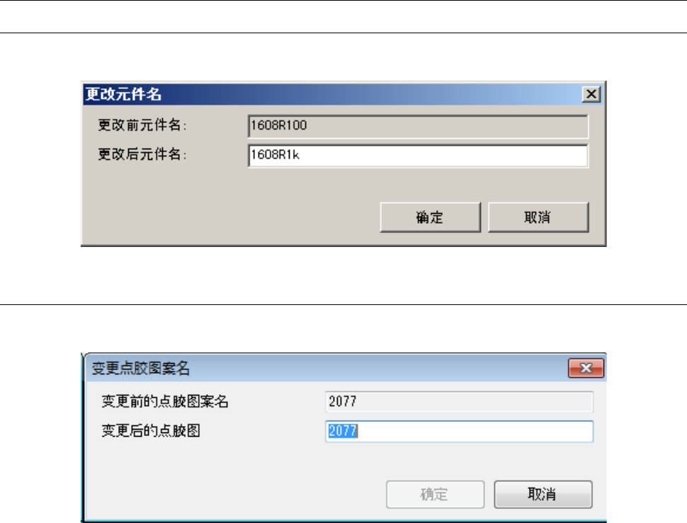 3- 21 3-4-9 更改元件名 / 点胶图案名 3-4-9-1 更改元件名 选择菜单的「编辑」-「更改元件名」,可将元件名更改为指定的元件名。 3-4-9-2 变更点胶图案名 选择菜单的「编辑」-「变更点胶图案名」,可将点胶图案名变更为指定的点胶图案名。