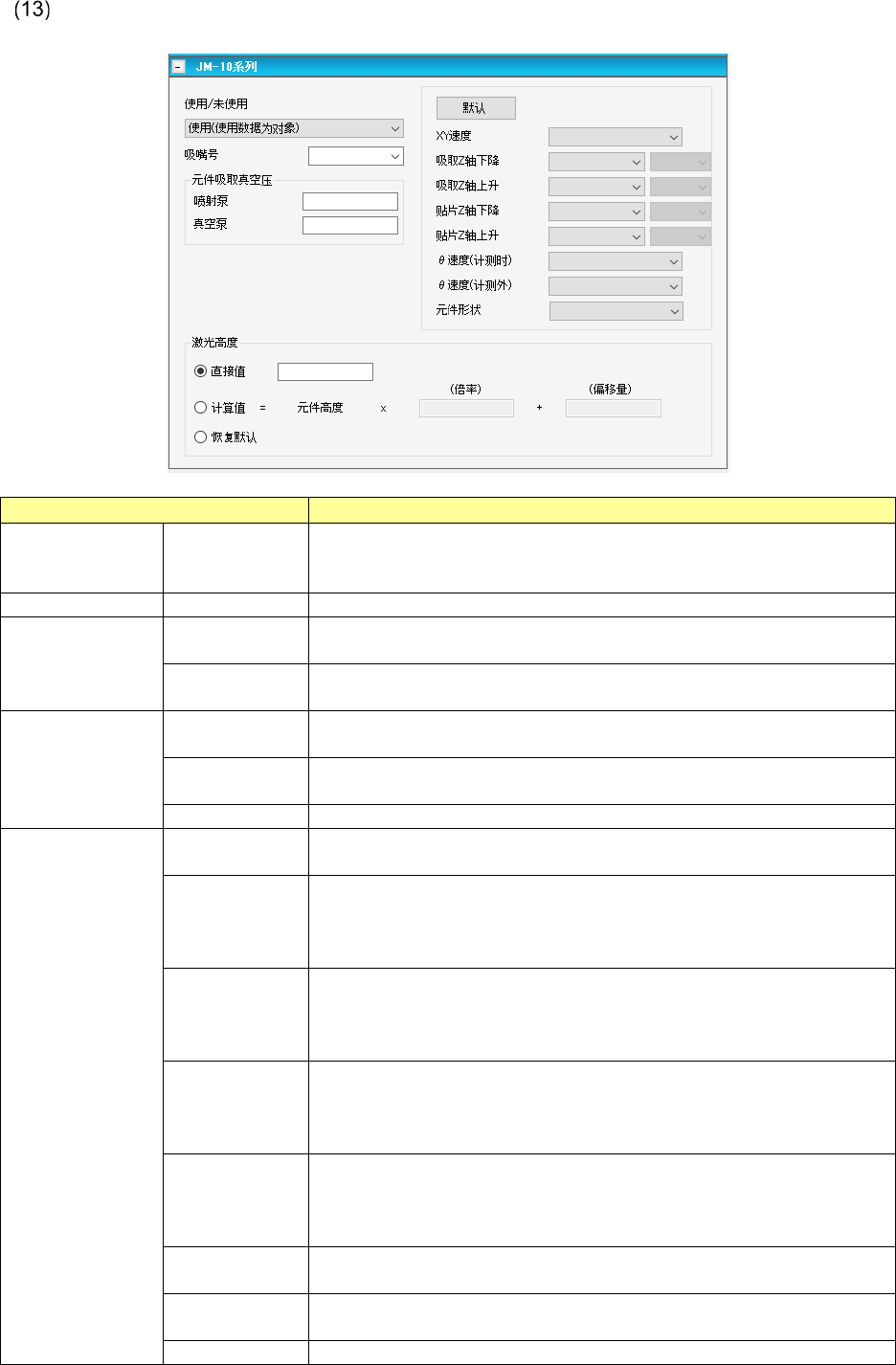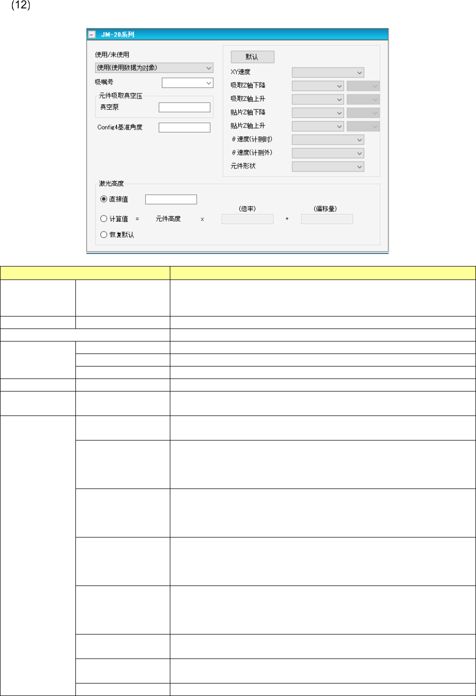 3- 37 替换项目(激光定心) (JM - 10 系列 ) 设置激光定心中要替换的 JM - 10 系列固有数据。 项目 内容 使用 / 未使用 使用 / 未使用 用组合框设置使用 / 未使用。 从「使用(使用的数据为对象) 」 「使用(不使用的数据为对象) 」 「使用(全部对象) 」 「不使用」中选择。 吸嘴号 吸嘴号 用组合框设置吸嘴号。 元件吸取真空压 喷射泵 设置元件吸取真空压的喷射泵。 替换后的值有时被取整。 真空泵 设置元…