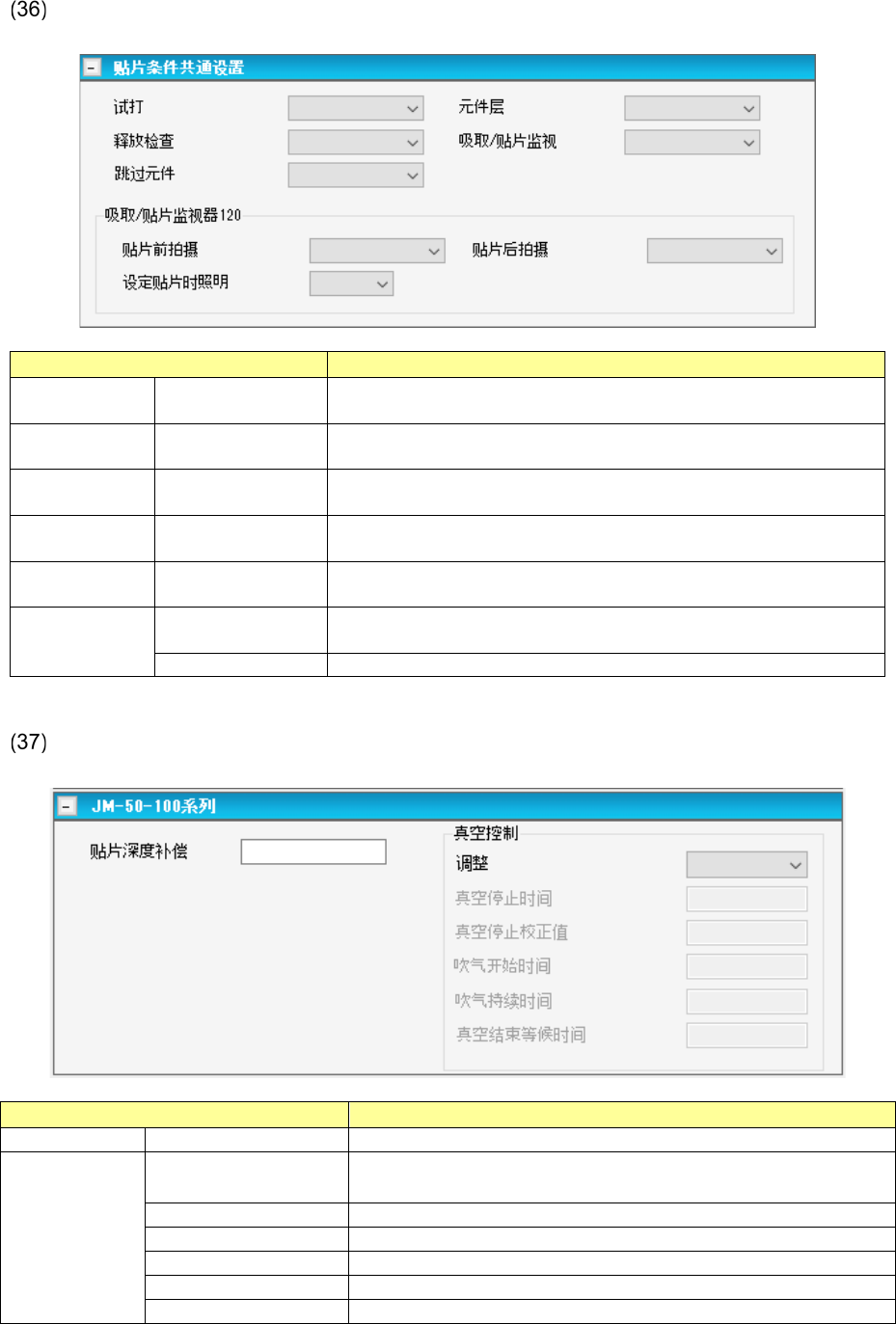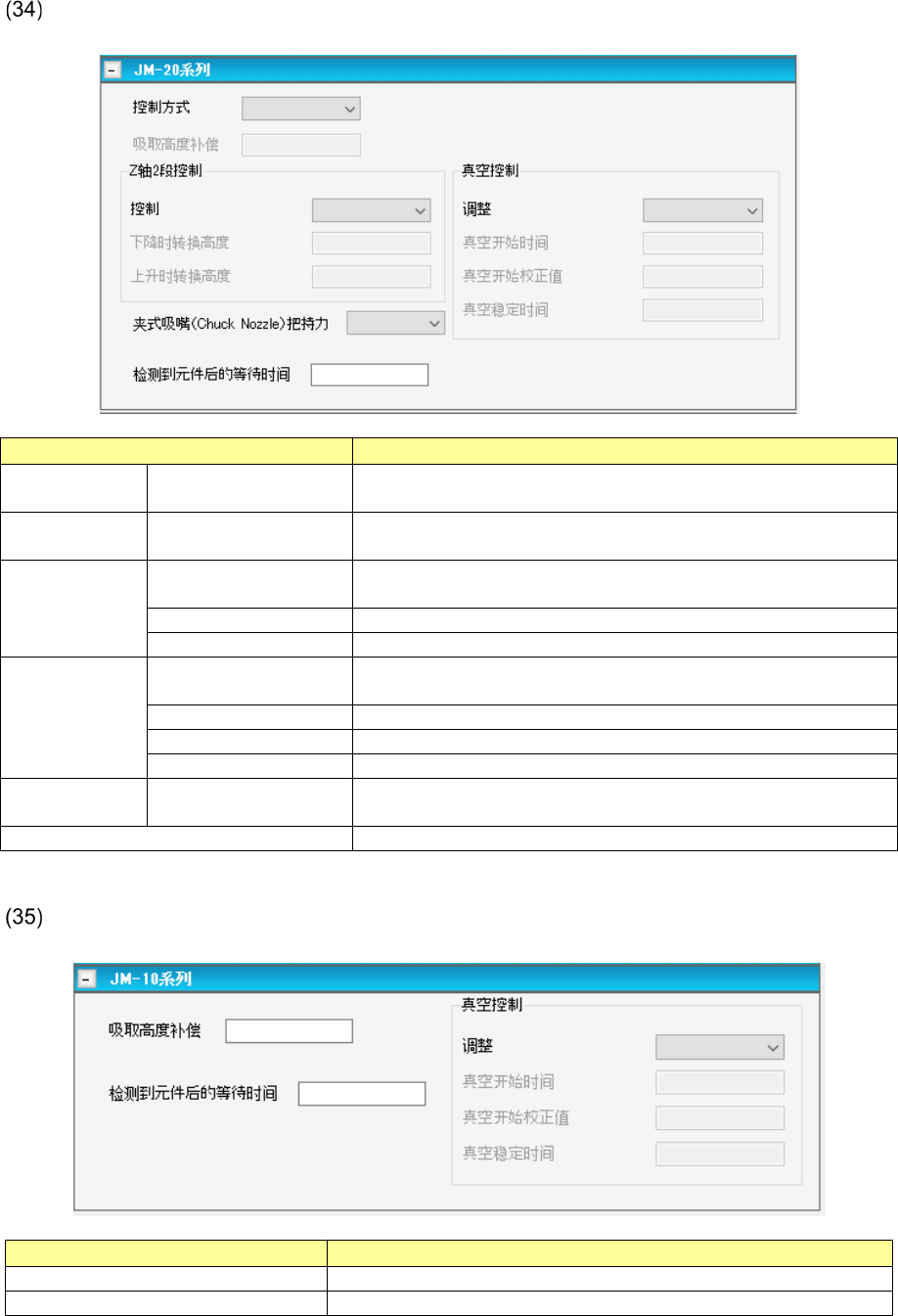 3- 54 替换项目(吸取条件)( JM - 20 系列) 设置吸取条件中要替换的 JM - 20 系列固有数据。 项目 内容 控制方式 控制方式 通过组合框设置控制方式。 从「行程 」「 负荷」中选择。 吸取 高度补偿 吸取高度补偿 控制方式设置为「行程」或「负荷」时,设置吸取高度补偿量。 Z 轴 2 段控制 控制 用组合框设置 Z 轴 2 段控制。 从「是」 「否」中选择。 下降时转换高度 进行 Z 轴 2 段控制时,设置下降时转换…