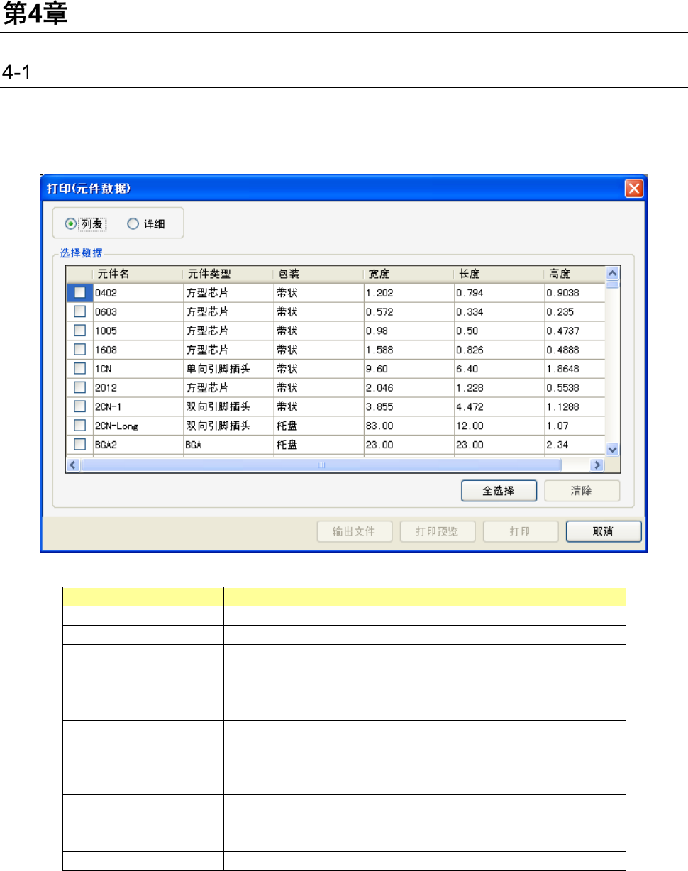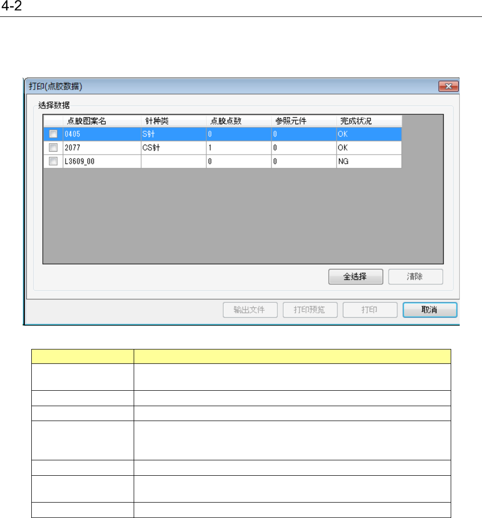 4-2 点胶数据打印 在显示点胶列表画面的状态,通过选择菜单的 「文件」- 「打印 & 文件输出」 ,显示出点胶数据打印画 面。 选择现在登录的点胶数据,执行打印或文件输出。 项目 内容 选择数据 选择要打印的点胶数据。 进行行选择或点击复选框,选择对象数据。 全选择 全部点胶数据为打印对象。 清除 将全部点胶数据从打印对象中除外。 文件输出 将现在选择的点胶数据保存在文件中。 可以选择将打印文件输出为 p df ,或者 csv…
