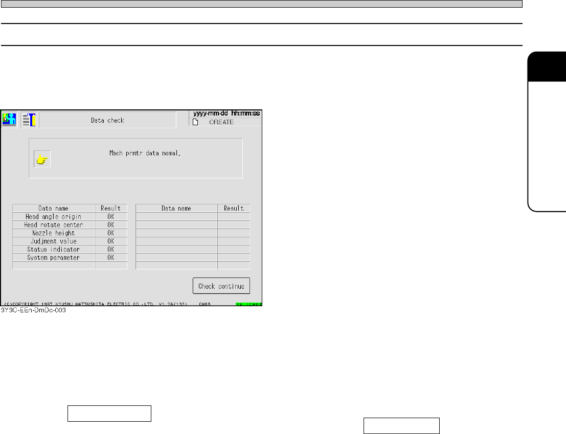Page 2-19 MA CHINE P ARAMETER 2 2-1-10 Data Check It is checked if the value of machine parameter is the one to be properly mounted. Make sure of carrying out “ Data check ” after “ Head exchange teach, ” “ Nozzle exchan…