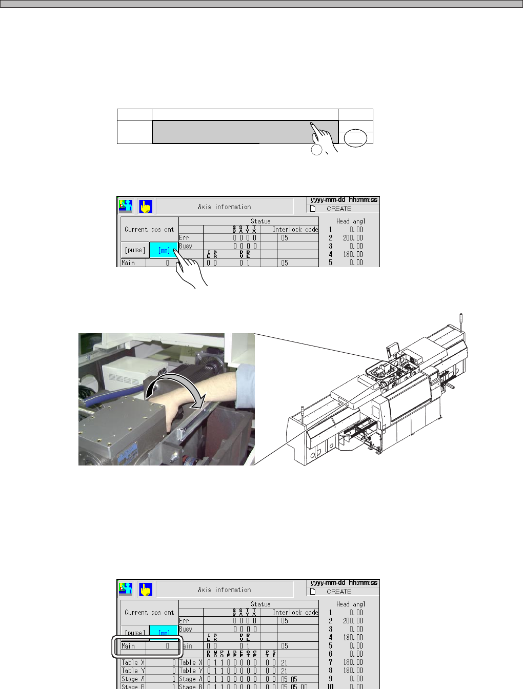 2.Display the “Axis information” screen after “Machine adjust,” and press the [mm] switch of the