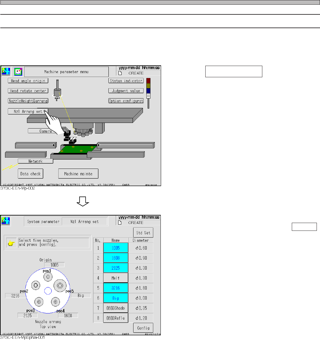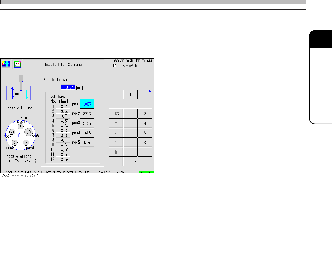 Page 2-5 MACHINE P ARAMETER 2 3Y3C-E-MMD02-A01-00 Items of Machine Parameter 2-1-3 Nozzle Height and Arrangement This parameter is set by “Nozzle exchange tea2ch” or “Head exchange teach.” The nozzle height for each tran…