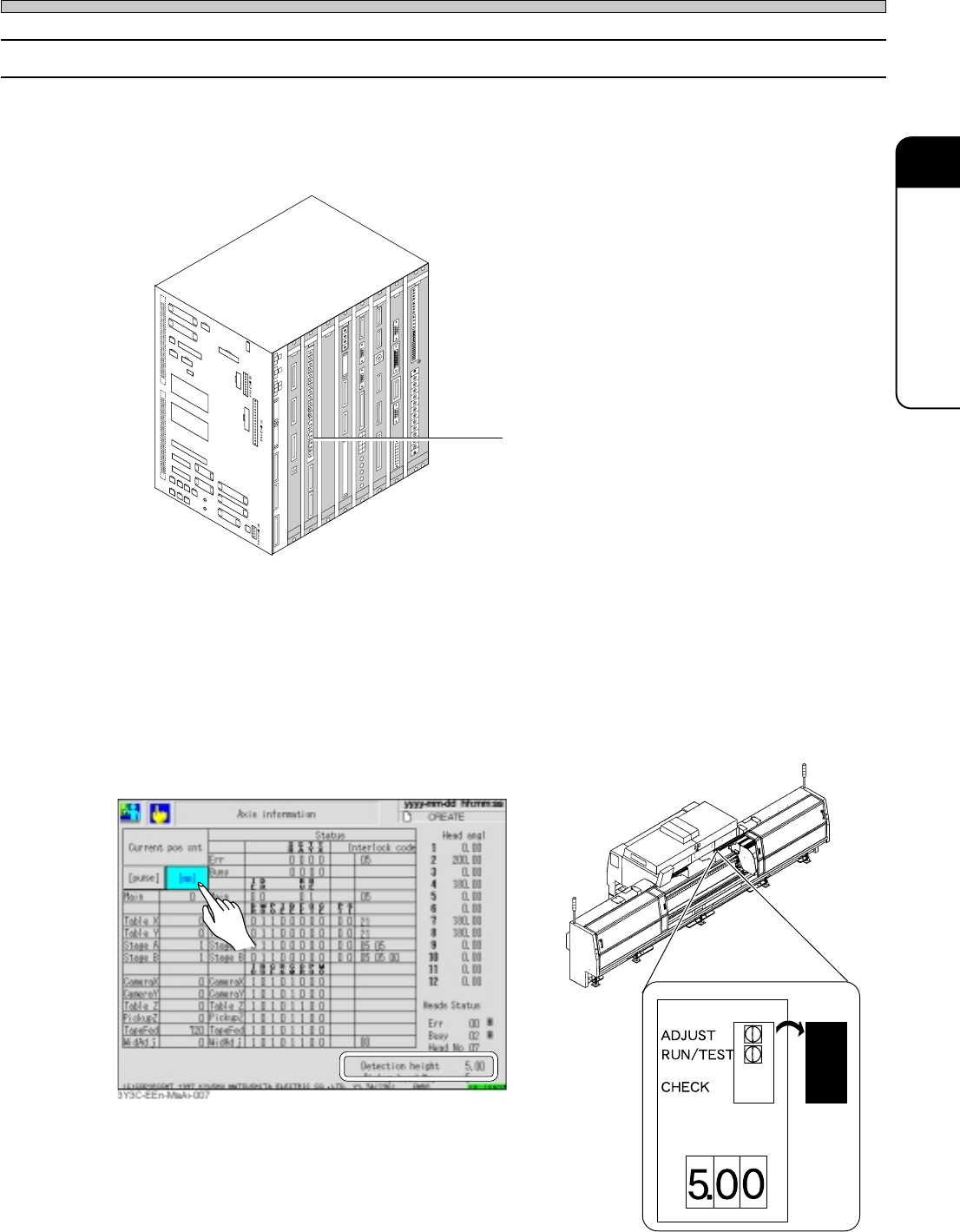 Page 3-24 3Y3C-E-MMD03-A03-00 Check and Solutions 3-2-21 W idth Adjust Error 1. Removing pins over the board size If support pins are set to the outside of board size, remove them. 3Y3C-091P 07JHC2AC