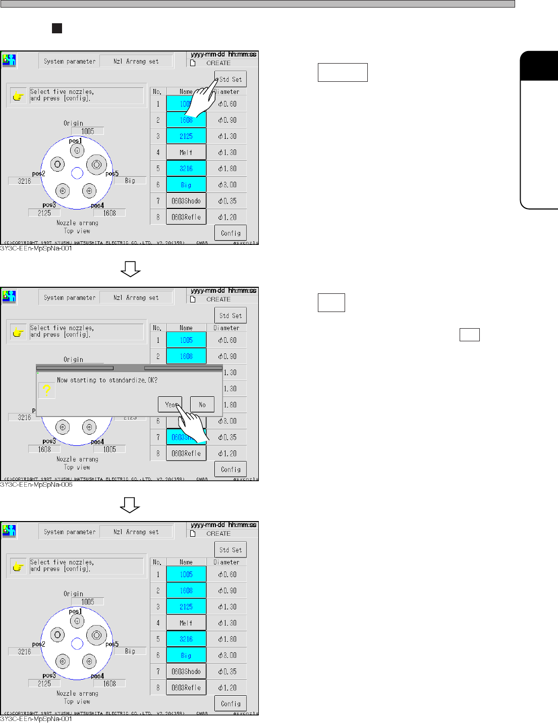 Page 2-7 MACHINE P ARAMETER 2 3Y3C-E-MMD02-A01-00 Items of Machine Parameter Standard setting 1 . Press Std Set . 2 . Press Ye s . • T o stop the standard setting, press No . • It is set to standard nozzle setting (1005,…