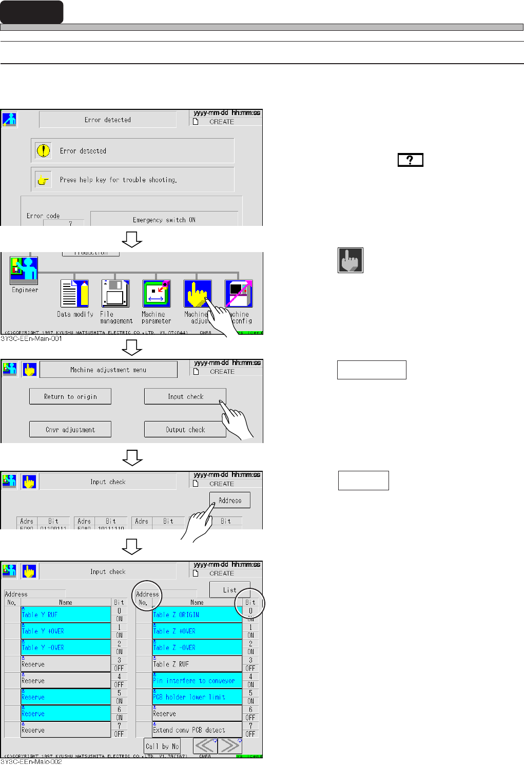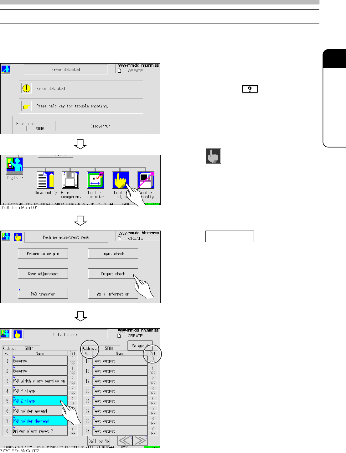 Page 3-53 SOLUTIONS FOR ERROR 3 3Y3C-E-MMD03-A04-00 The Input and Output Check of Machine 3-5-2 Output Check after Error The trouble in the movable part can be thought as one reason to make errors. This section describes…