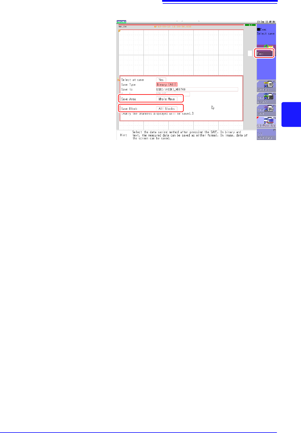4.2 Saving Data 97 4 Chapter 4 Saving/Loading Dat a & Managing Files 6 Set [Save Are a] . (All waveforms or waveforms between A and B) 7 Set [Save Block ] . [All Blks] Saves all blocks with waveforms. [St art-End] Sa…