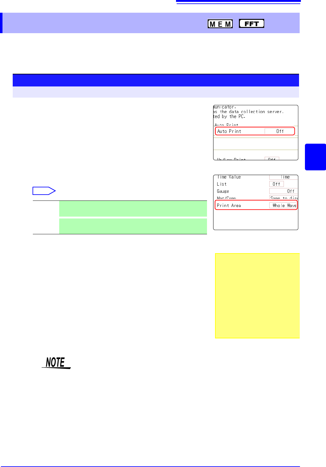 5.2 Making Auto Print Settings 111 6 Chapter 5 Printing 5 This applies to the Memory function, Recorder function , and FFT function. Make these settings before mea surement. Measurement data is printe d automatically whe…