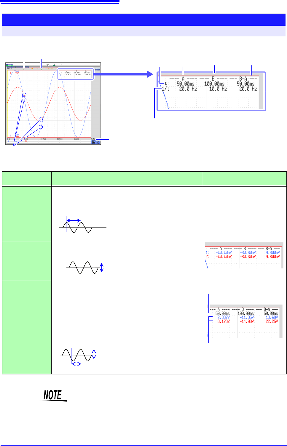 t: A, B each cursor value: Time from trigger point or recording
