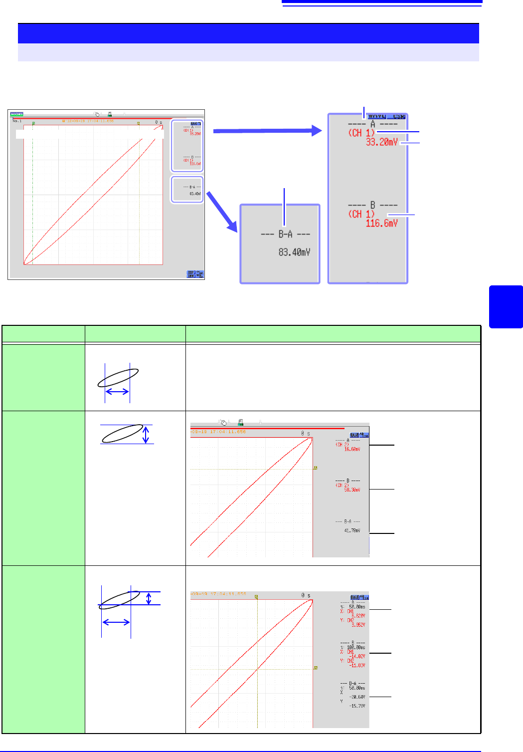 A, B each cursor value: Time from trigger point or recording start