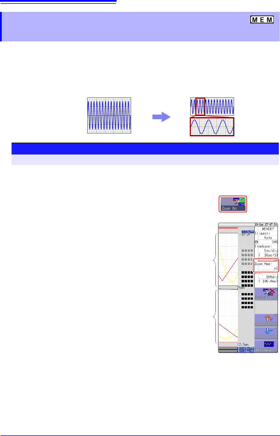 With the waveform displayed normally on the upper half of the screen, a section magnified along the