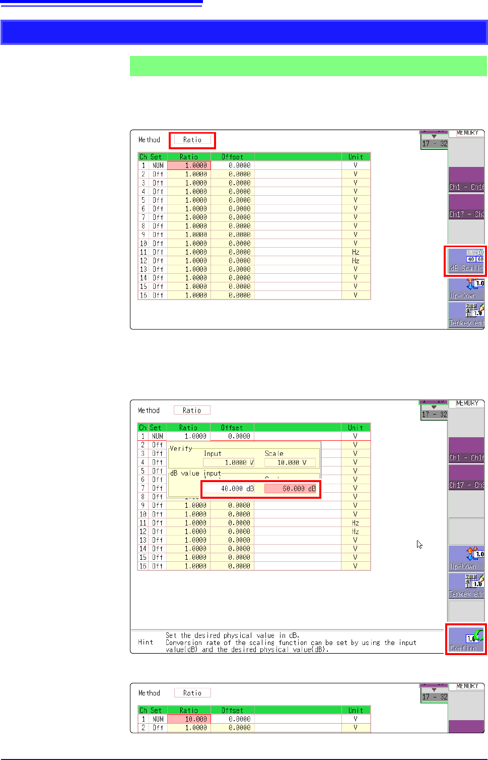 7.4 Converting Input Values (Sca ling Function) 154 1. For scaling, set the [Method] to [Ratio] . 2. Point the flashing cursor to the conversion rate setting and select [dB Scal- ing] . 3. In the displaye d entry field a…