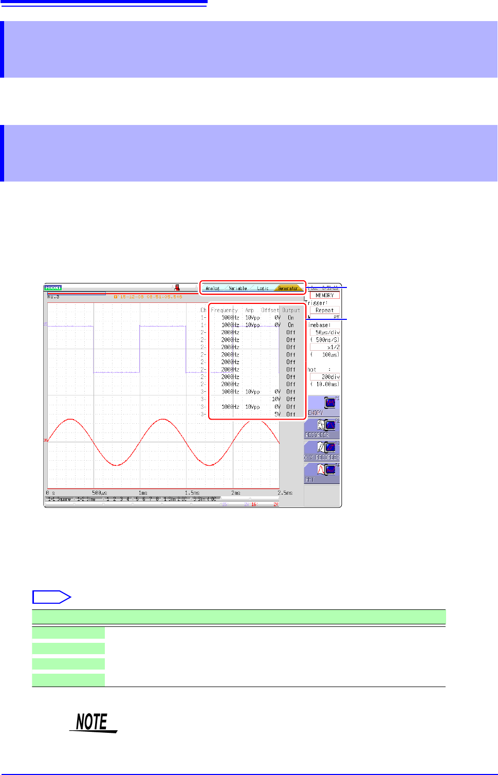 Parameters (frequency, amplitude, and offset) for the output waveform that was configured on the Generator