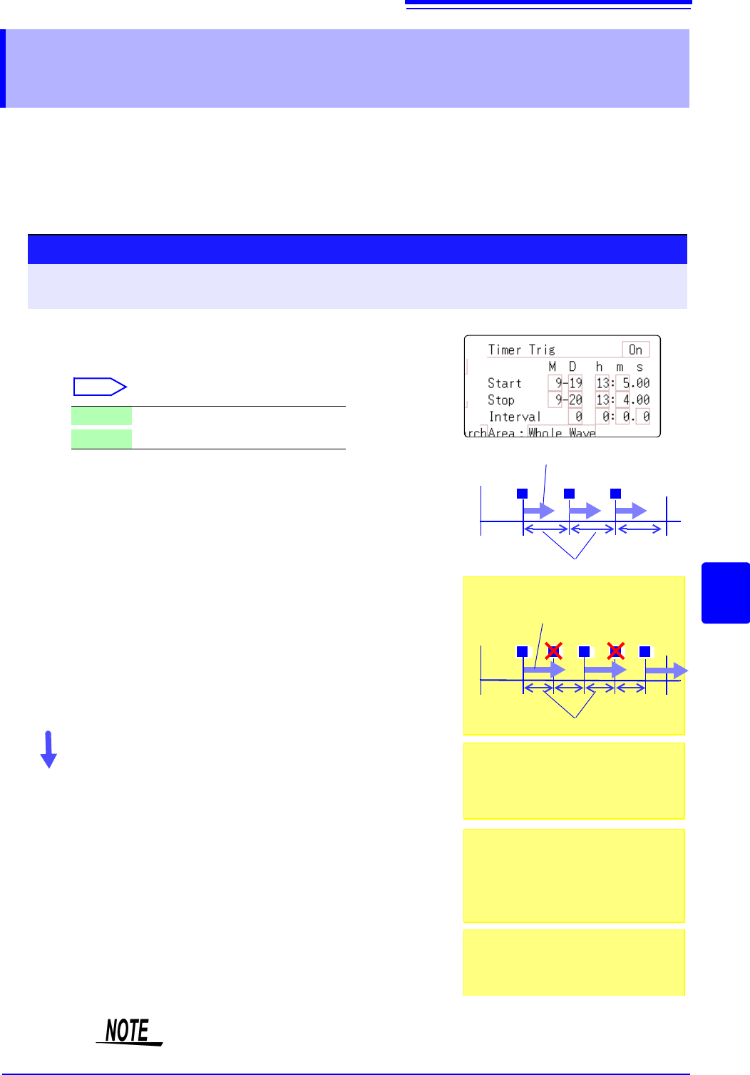 8.5 Trigger by Timer or Time Intervals (Timer Trigger) 200 Description About st art and stop times • S tart and S top times should be set as times elapsed sin ce the measurement was star ted. • When th e trigger mode is …