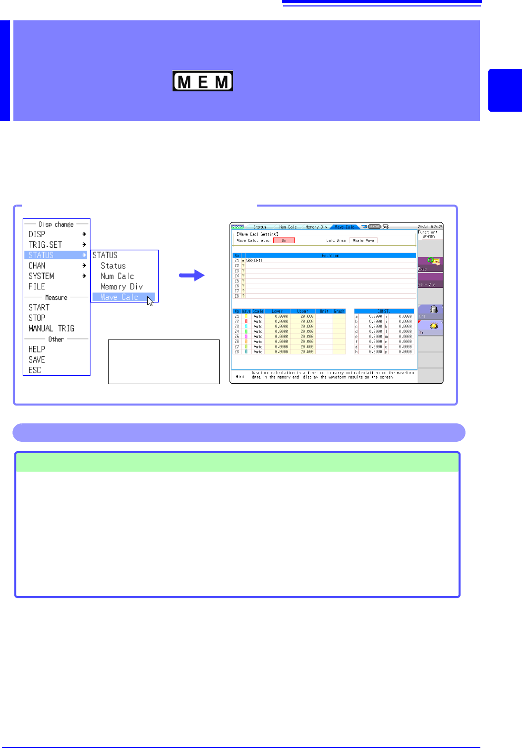 Waveform calculation settings are made on the Status screen - [Wave Calc] sheet.
