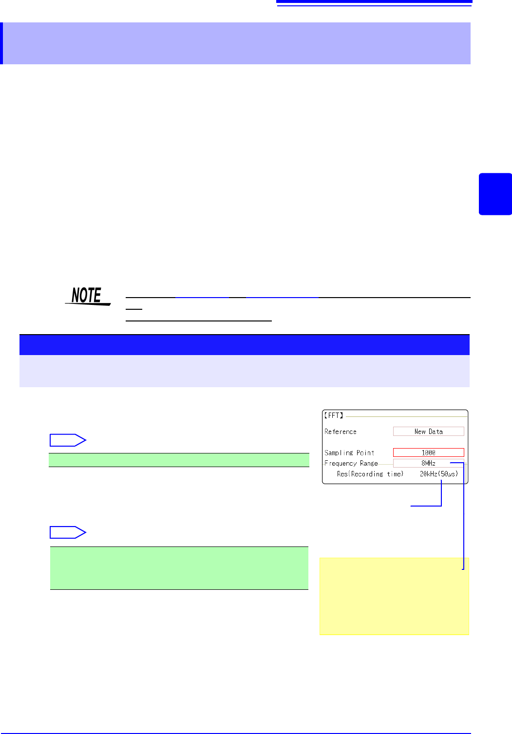 12.3 Setting FFT Analysis Conditio ns 252 Relationship Between Frequency Ra nge, Resolution and Number o f Analysis Point s Range [Hz] Sampling frequency [Hz] Timebase [/div] (MEM) Sampling period Number of FFT Analysis …