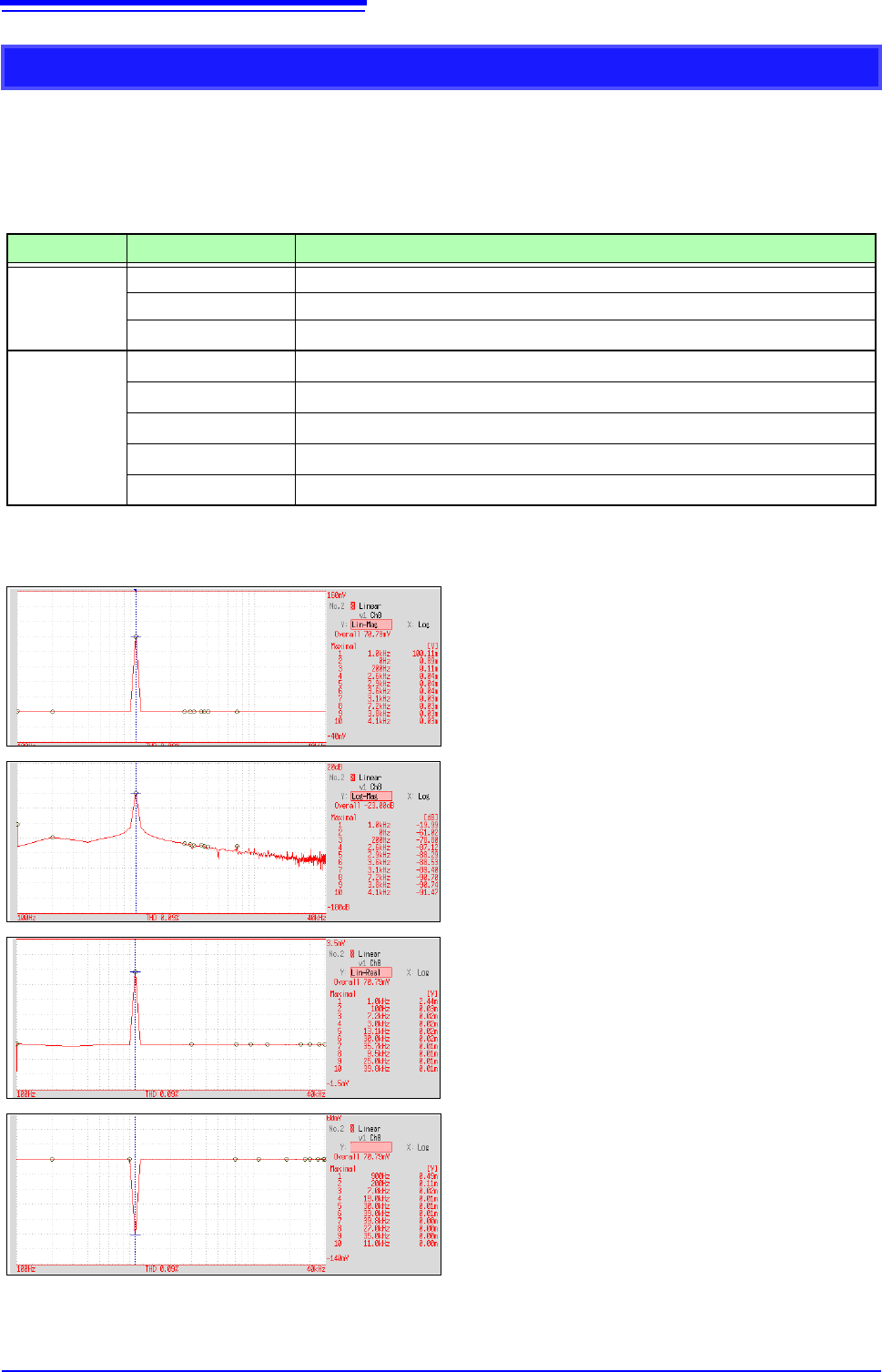 12.8 FFT Analysis Modes 275 11 Chapter 12 FFT Function 12 For the functions of each analysis mode, se e"12.8.2 Analysis Mode Functions" (p.293). W aveform Example W aveform Example 12.8 FFT Analysis Modes 12.8.…