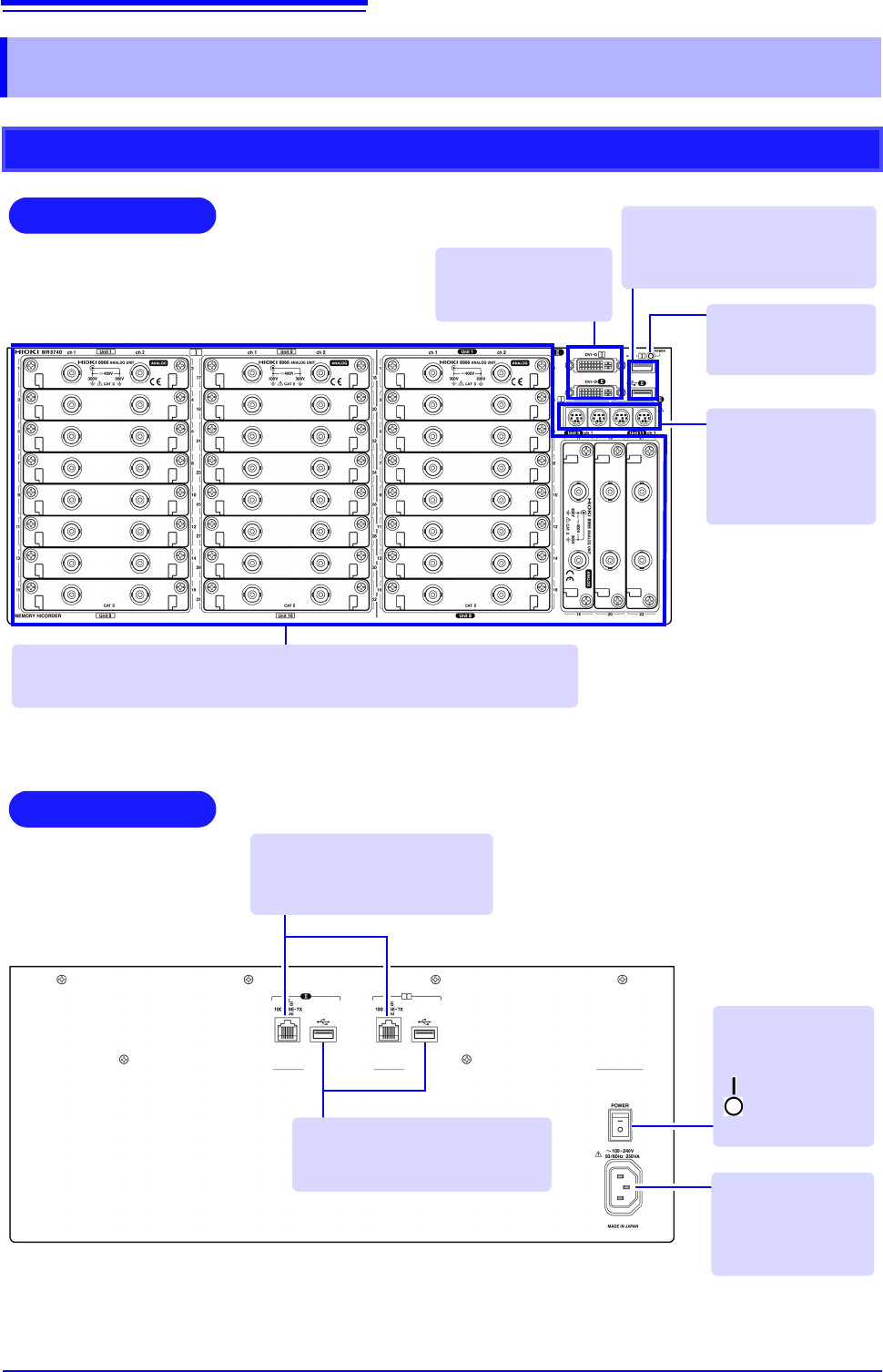 1.2 Names and Functions of Parts 17 1 Chapter 1 Overview MR8741 Rear V arious Modules (p.36), (p.39) (For details, see the instruc- tion manual of the respective module.) 100BASE-TX Connector Connect a LAN cable here. (p…