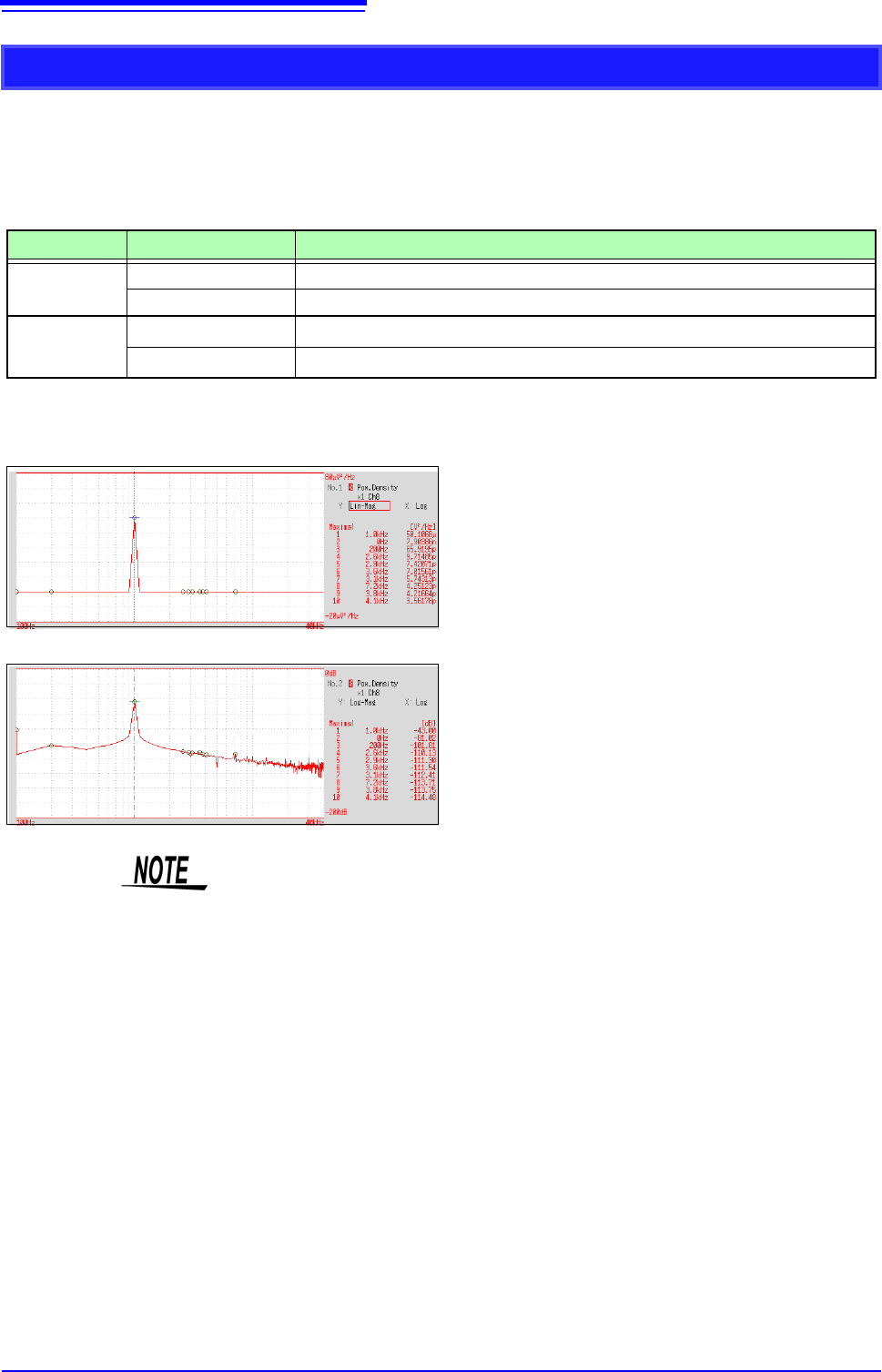 12.8 FFT Analysis Modes 280 W aveform Example Power Spectrum Density Indicates the power spect rum density of the input signal with only th e amplitude component included. This is the power spect rum divided by the frequ…