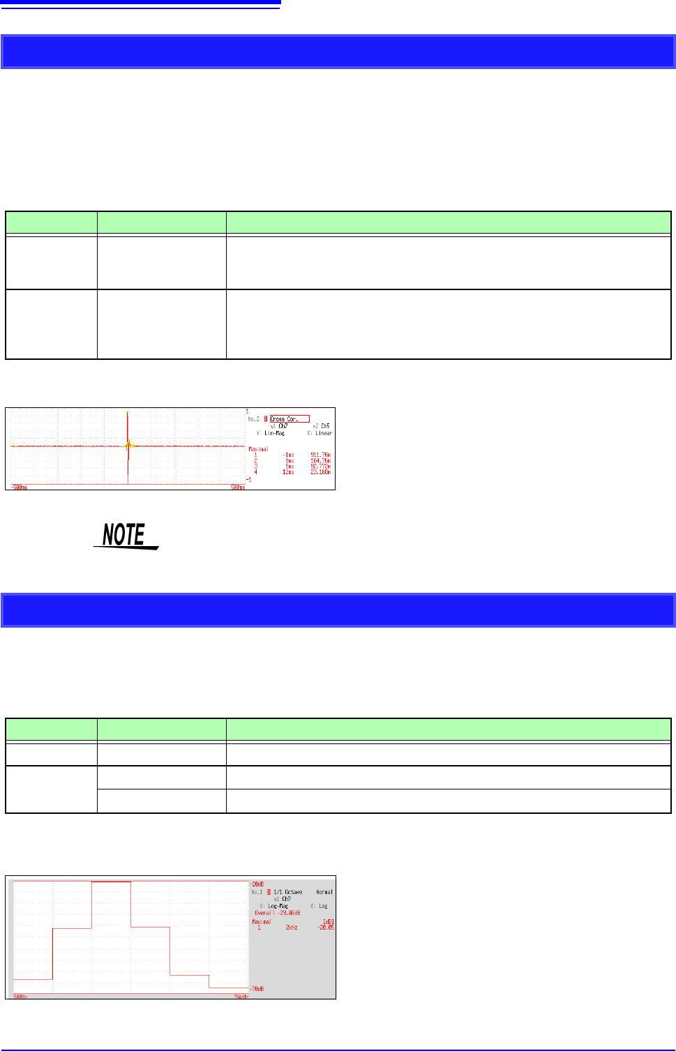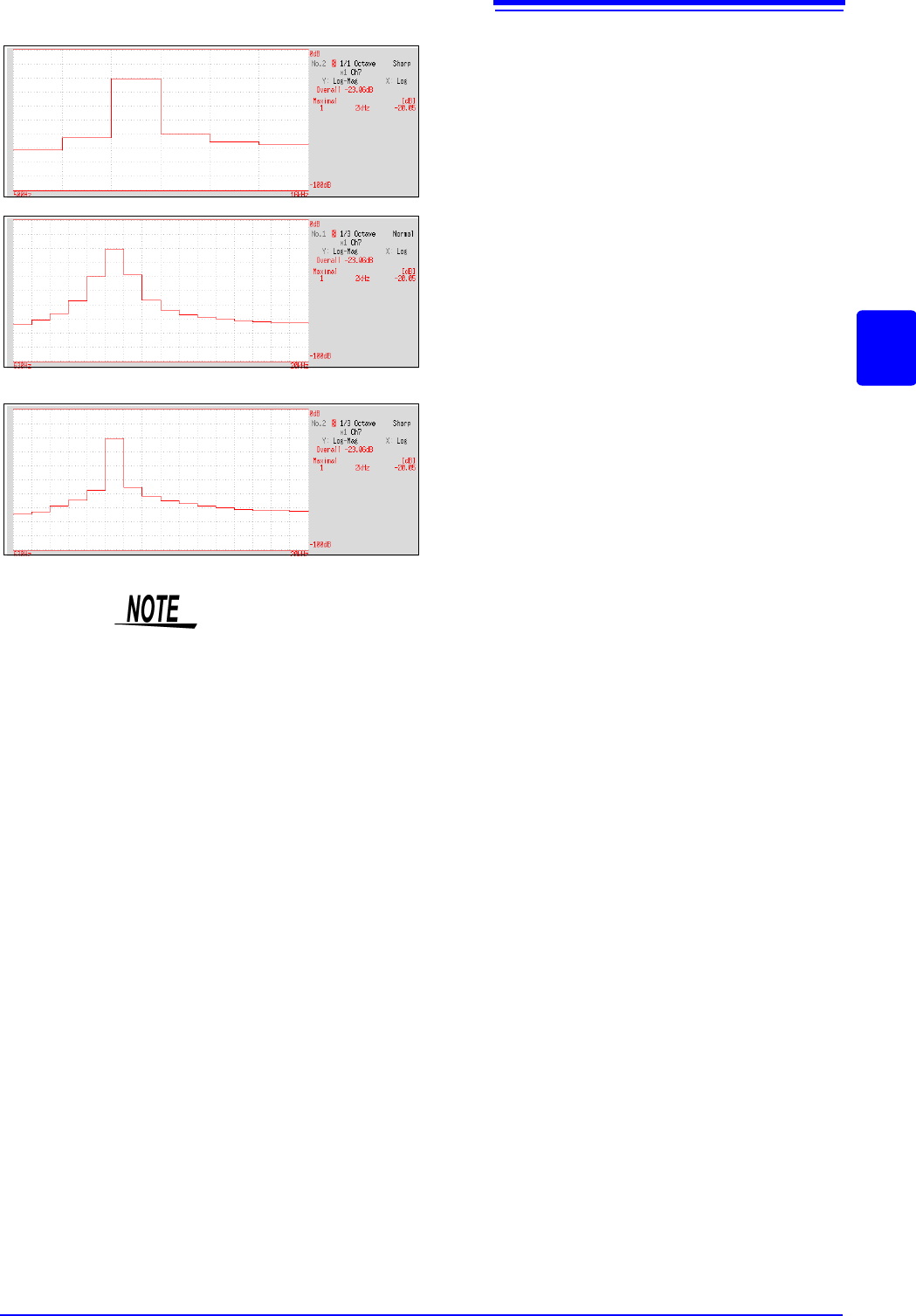 12.8 FFT Analysis Modes 289 11 Chapter 12 FFT Function 12 Oct ave Analysis Octave analysis consists of frequen cy analysis of the signal passed throug h a constant-width ba nd-pass filter. The power spectrum displays t…