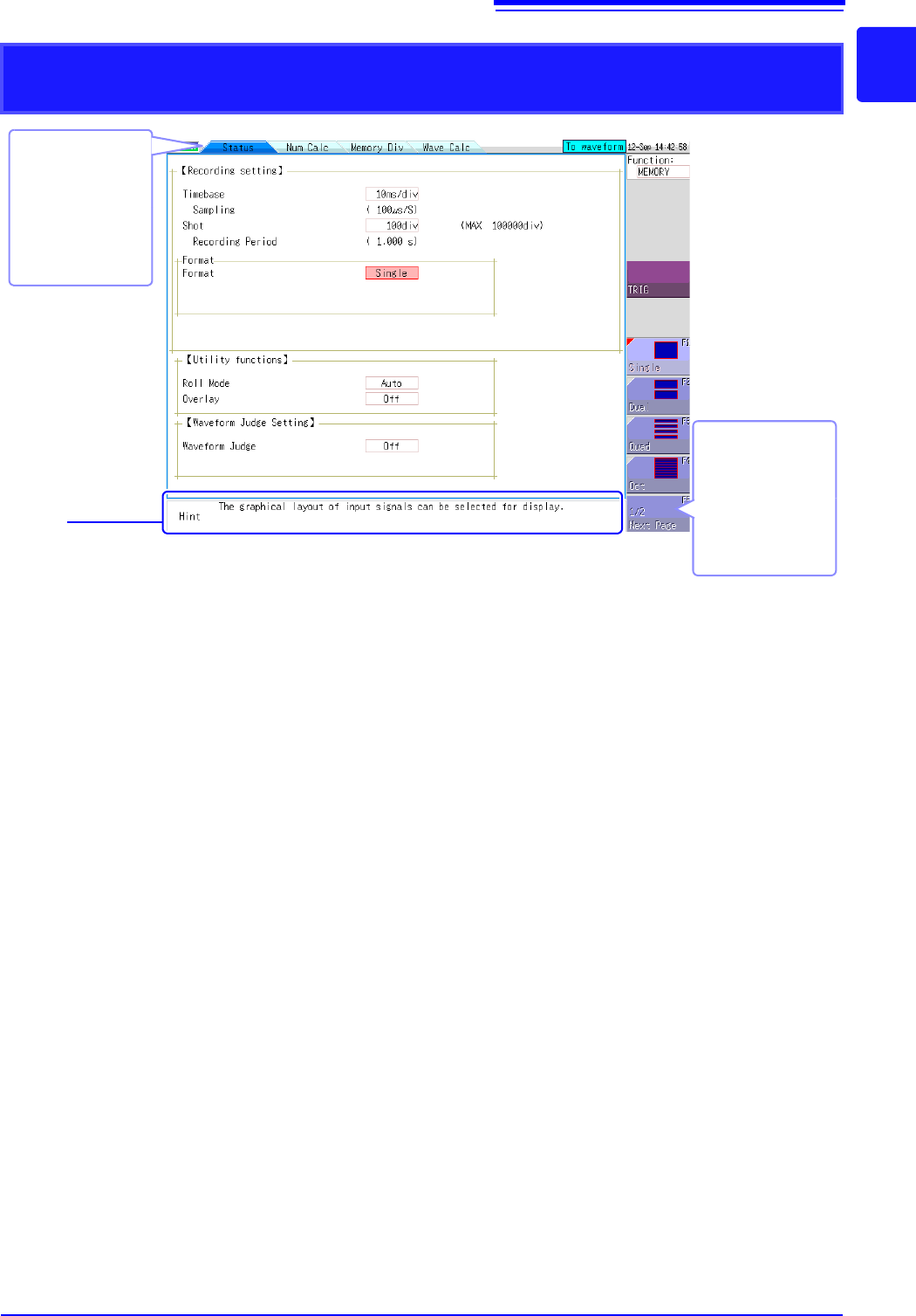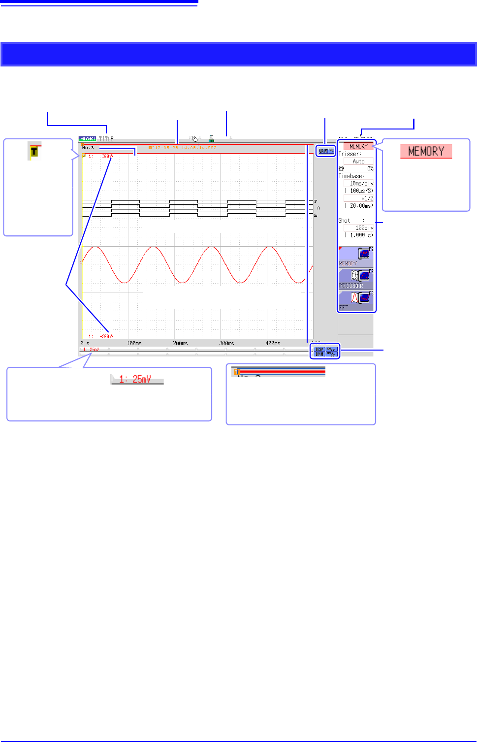1.4 Screen Configuration 20 Explanation of Screen Cont ent s _____________ _____________________ W aveform Screen Logic waveform (p.79) Analog waveform (p.76) Stora ge counter Shows how many trigger events occurred . (p.…