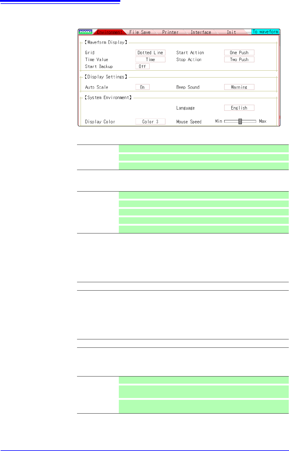 Display Color Screen background and character colors on the Waveform screen can be set as