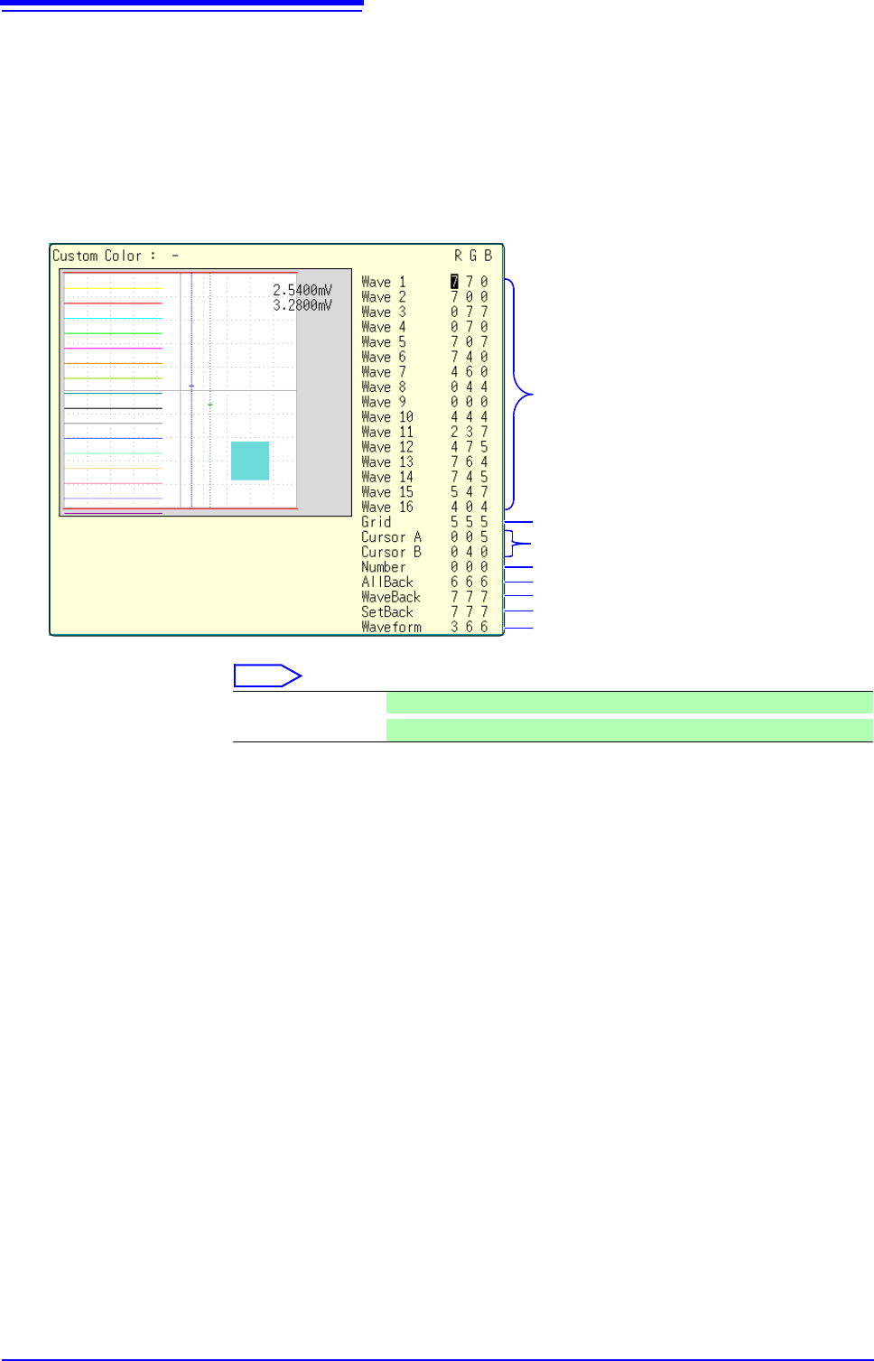 Display Color Screen background and character colors on the Waveform screen can be set as