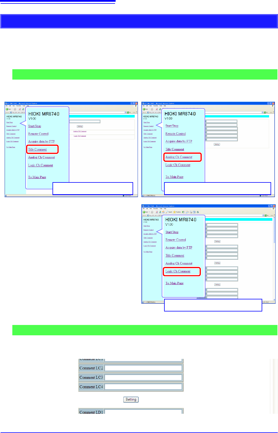 To open the screen: Click [Title Comment], [Analog Ch Comment], or [Logic Ch Comment] on list of