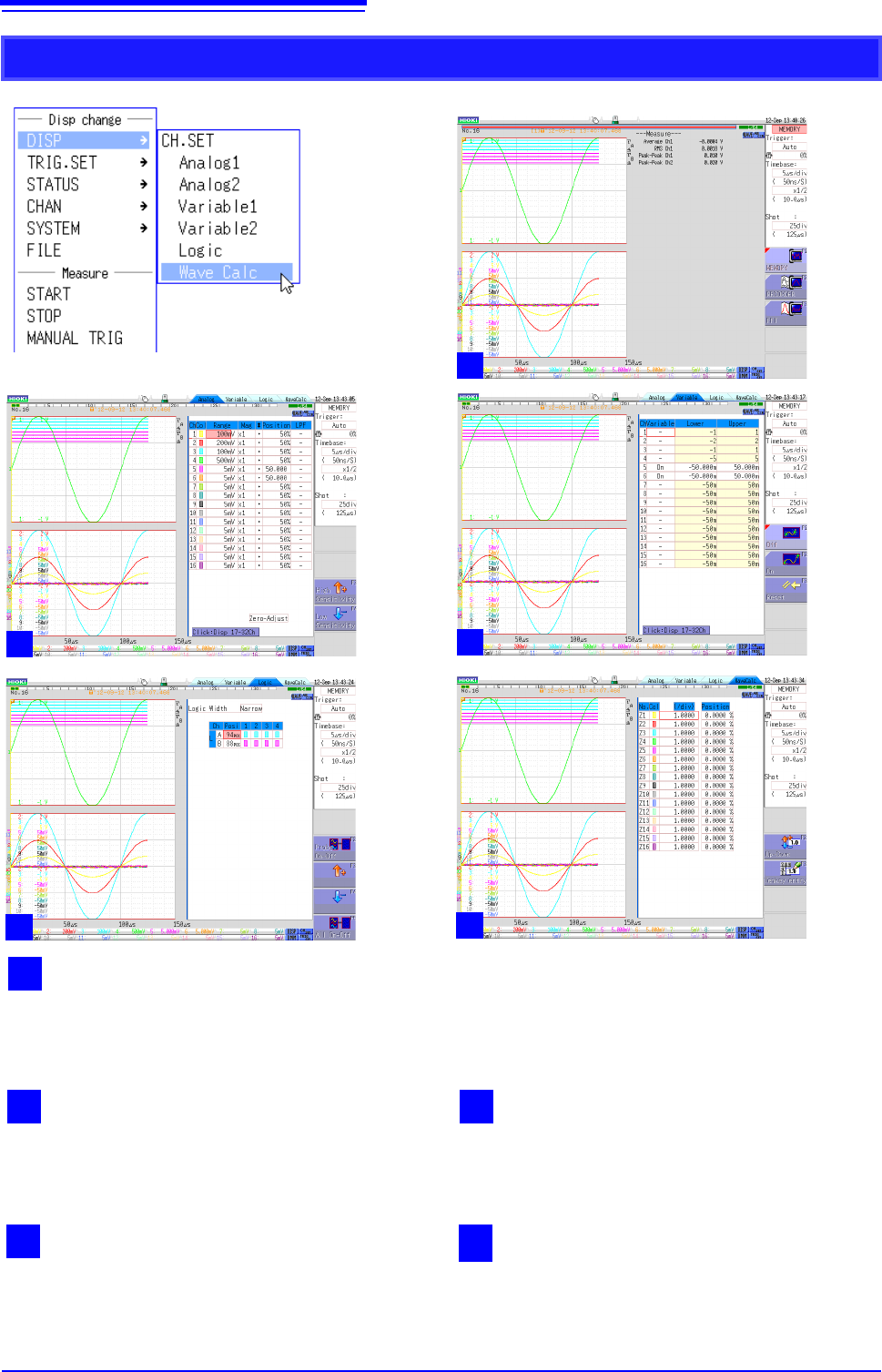 1.5 Basic Operations 24 CH.SET 1 W aveform dis play This is the normal waveform disp lay state. Move the cursor to [DISP] and then click any of the menu items under [CH.SET] to switch to one of the screens 2 to 5. Altern…