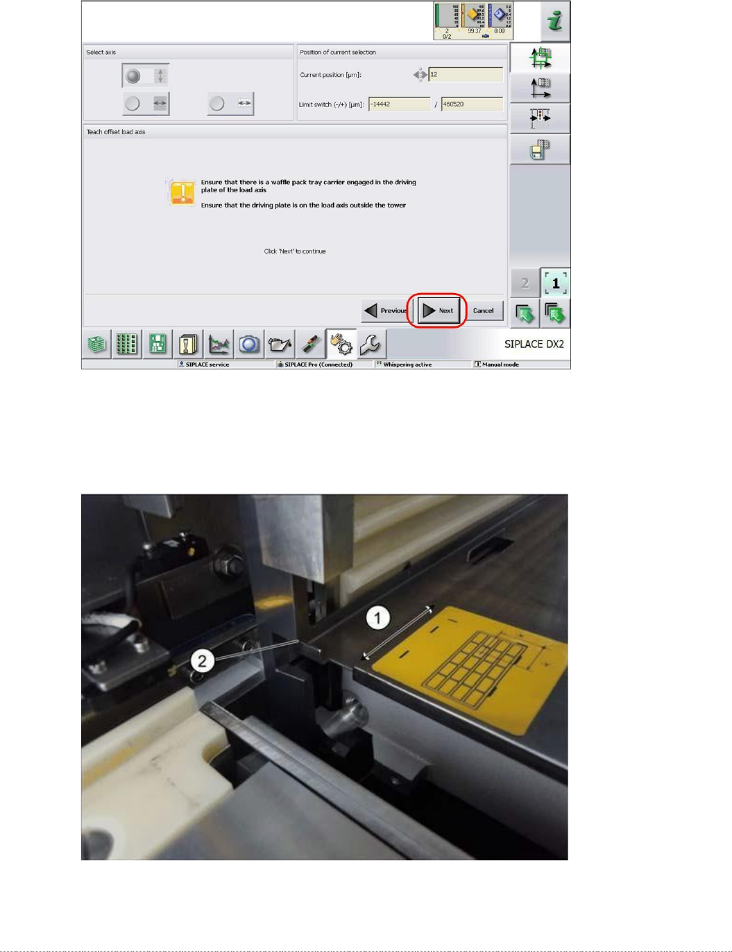 维修手册 WPC5 / WPC6 第 4 页 - 121 按照显示的说明进行操作并继续下一 步。 将 “ WPC4- 6 底板夹具 ” [03073064-01] (或 WP TC ) (1) 放在负载轴的滑轨上。 将压力表推入塔架 (2) 。 确保量规能沿滑轨顺畅移动。
