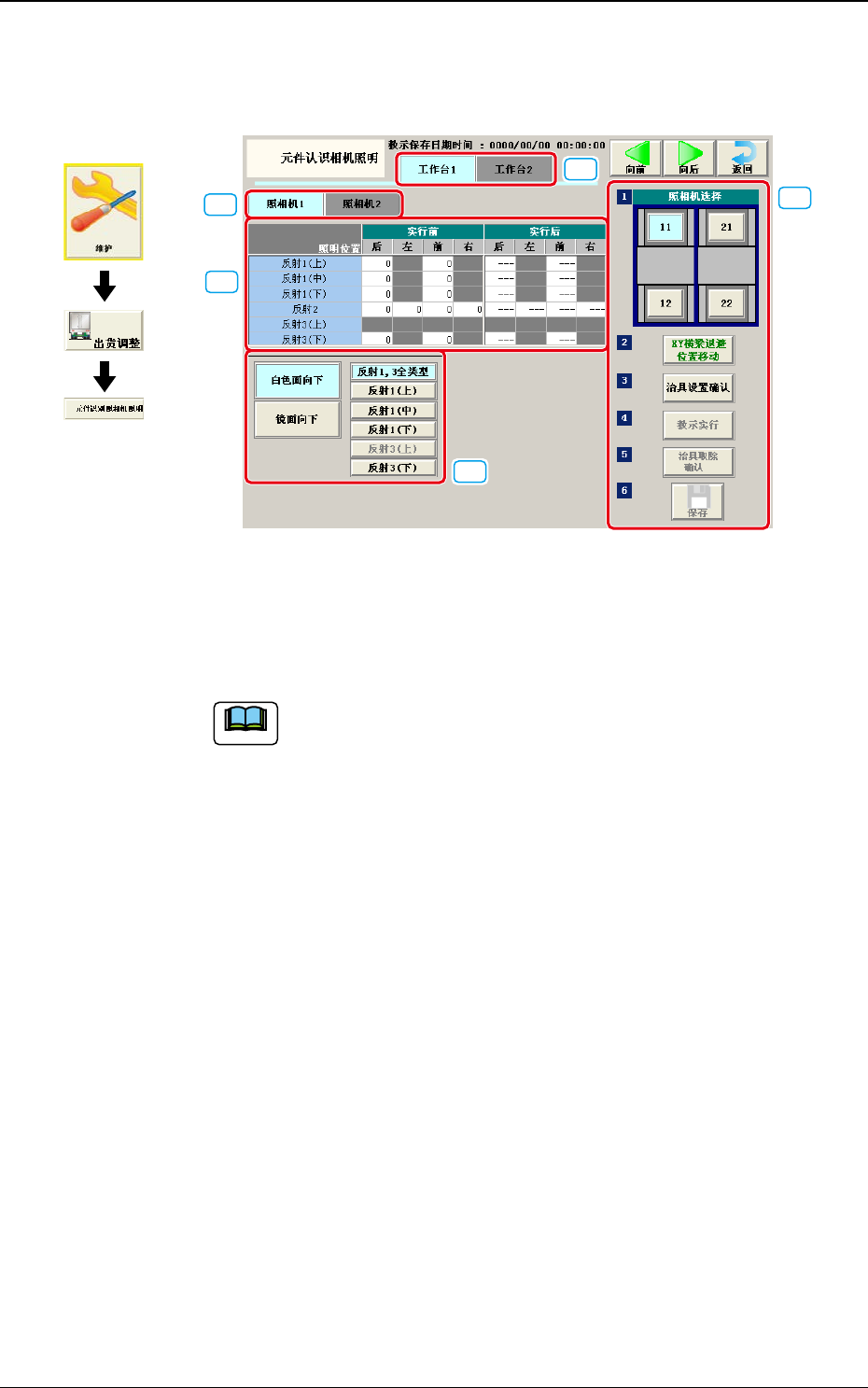 3OM-1732 1-5-7 5.4 元件认识相机 ( 识别照相机 ) 照明 进行元件识别照相机照明的教示。 [2] [1] [3] [4] [5] Fig.3A5-6 [1] 工作台选择 Tab 进行工作台 1、2 的选择。 Note  自动切换到照相机选择中指定的工作台。  [2] 照相机选择 Tab 选择进行教示的照相机。 [3] 教示数据显示部 显示指定照相机的各照明模式的补正值数据。 [4] 照明模式选择 从以下选择照明模…