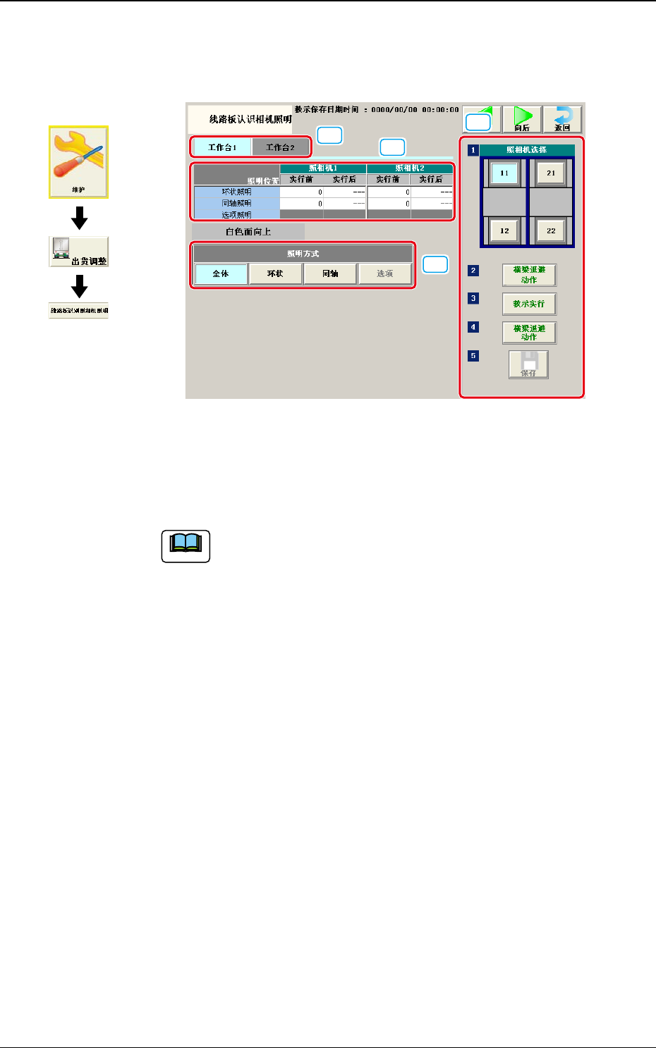 3OM-1732 1-5-10 (9) 按下 [ 治具取除 ( 拆取 ) 确认 ] 按钮。 (10) 按下 [ 保存 ] 按钮,保存教示结果。 (11) 关闭开闭盖,按下机盖锁定开关 ([ 机盖 READY] 按钮 )。 1209-002 5.4 元件认识相机 ( 识别照相机 ) 照明