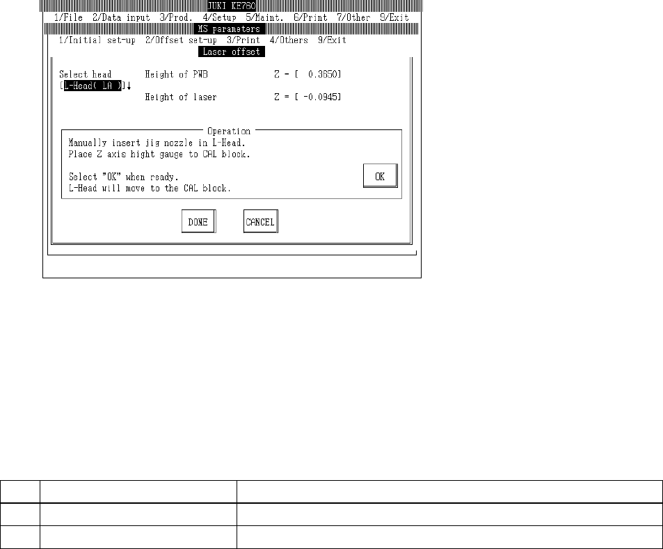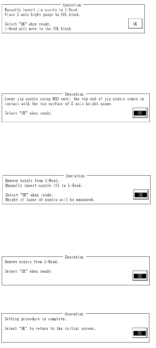Selecting "OK" causes measurement of nozzle laser height from the laser.