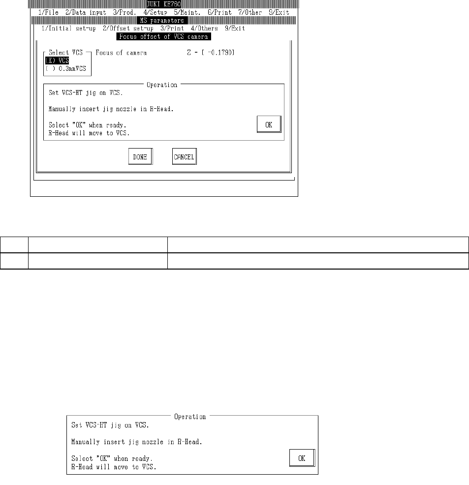 Select "2/Offset set-up" then "5/VCS", "1/Focus offset of VCS camera" and the VCS camera focus