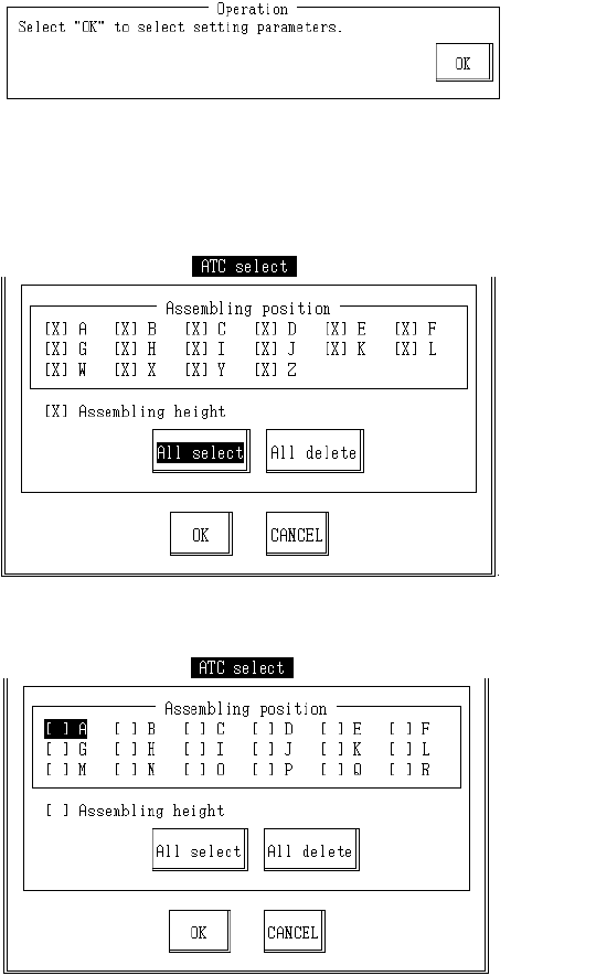 Select setting parameters. Select "OK" and selected parameters are set. When "Cancel" is selected, parameter selection is stopped. Set ATC offset boss in setting ATC NO. Once completed, select "O…