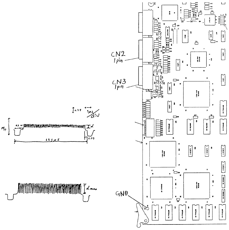 5) Connect IMG-P PWB assy to an oscilloscope. To focus the camera on the VCS(0.4) assy, connect CN2 1 pin to GDN as shown at right. To focus the camera on the VCS(0.3) assy, connect CN3 1 pin to GDN. 6) While watching th…