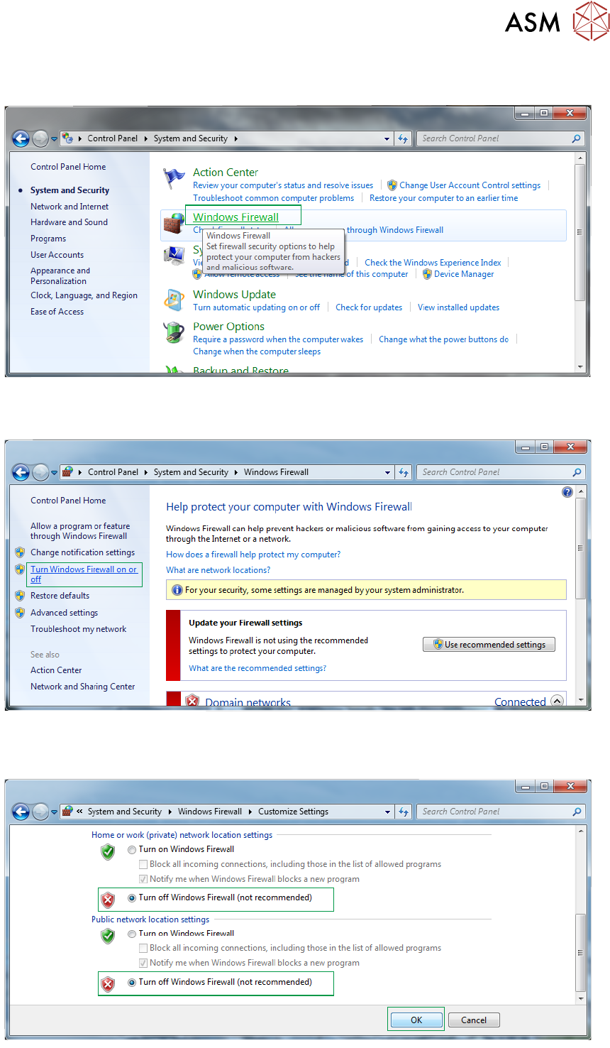 ► Select Turn off Windows Firewall radio buttons for both private and public networks.