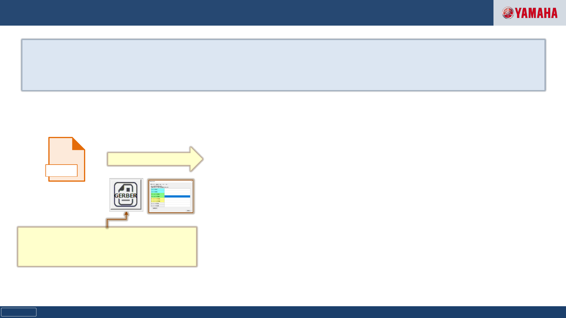 Copyright © Yamaha Motor Co., Ltd. All Rights Reserved. Confidential SJP0020B00- 00 YSUP Programming | Gerber 图 像工具⇒ 检查 机数据 链 接 18 可以将捕 获 的 Gerber 数据用作 检查 机数据 图 像。 即使您没有真正的 电 路板,也可以 创 建虚 拟电 路板映像并 创 建数据。 GERBER Gerber 数据 …