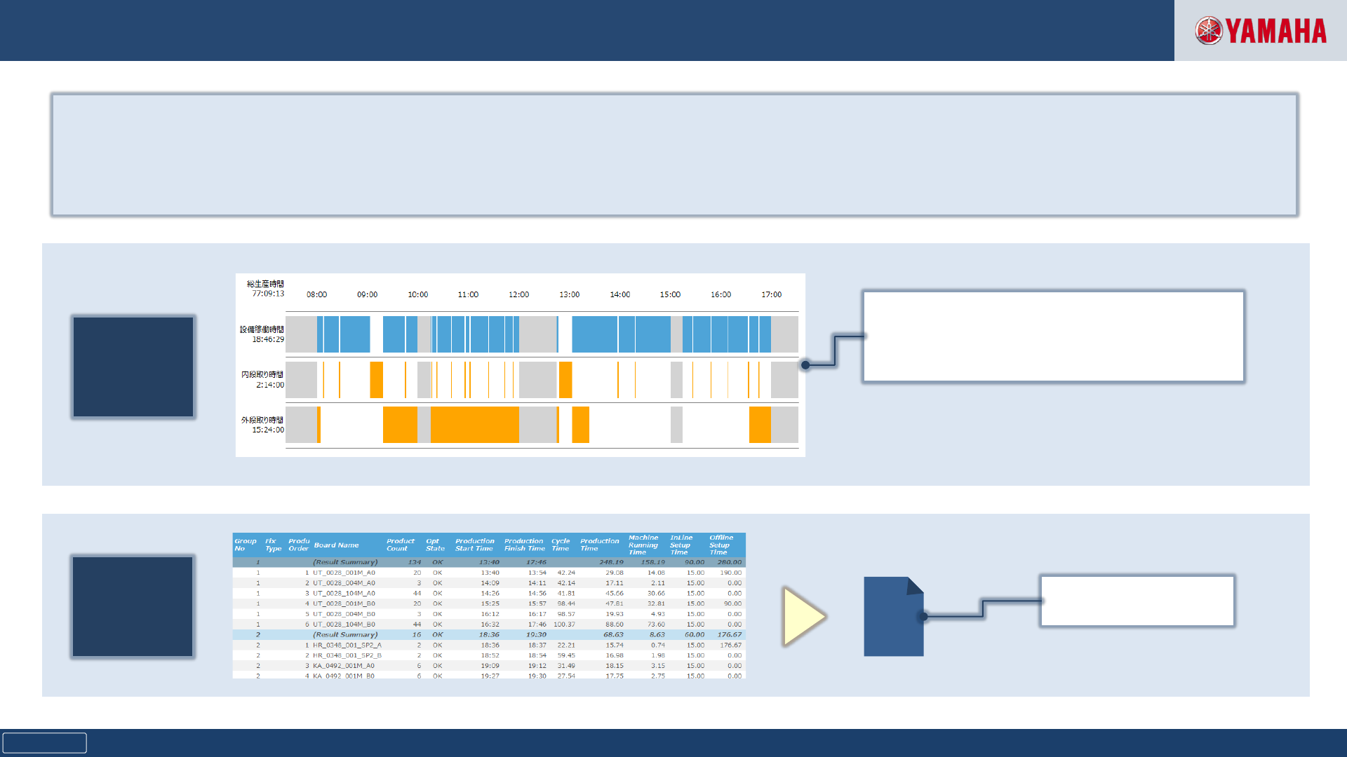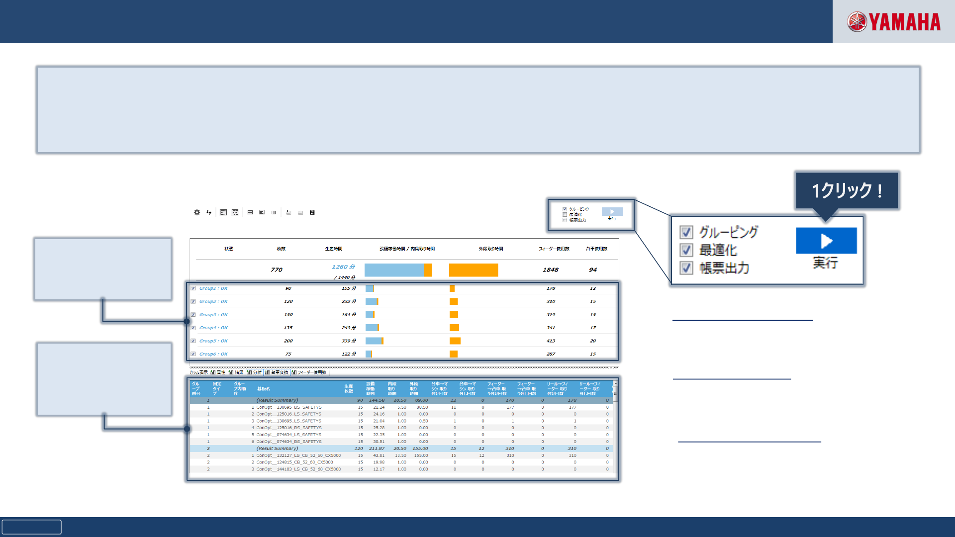 Copyright © Yamaha Motor Co., Ltd. All Rights Reserved. Confidential SJP0020B00- 00 YSUP Programming | 生 产计 划(分 组 功能) 23 单击 “ 执 行”即可完成分 组过 程。 通 过设 置各种 详细 条件,可以根据各种生 产样 式 进 行分 组 。 ✓ 基板分類指定が可能 ✓ マシン CT 優先設定 ✓ 固定品種グループ設定 可以…