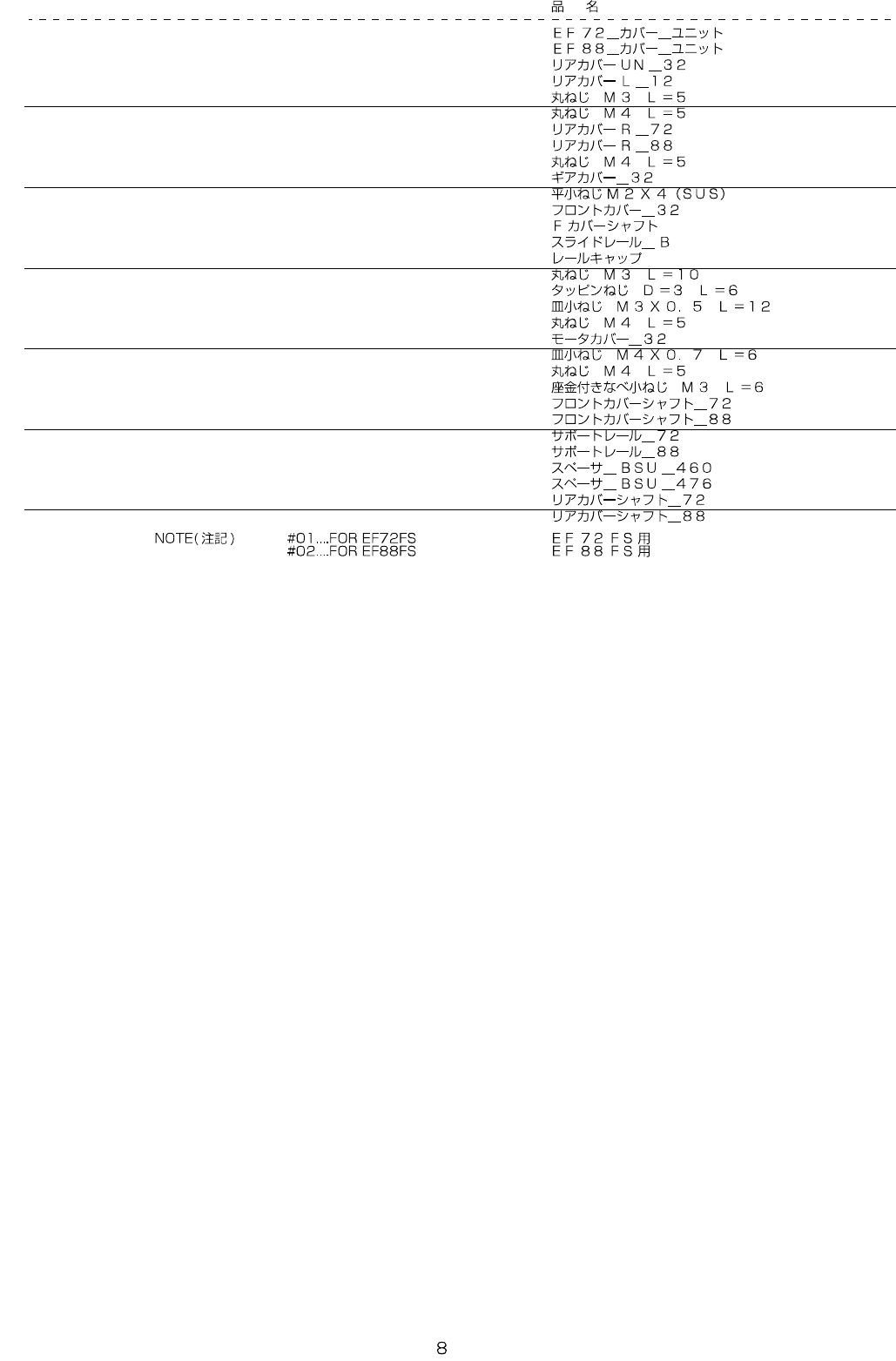 - - REF.NO NOTE PA RT NO D E S C R I P T I O N Qty 1 #01 401-32184 EF72_CO VER_UNIT 1 2 #02 401-32198 EF88_CO VER_UNIT 1 3 400-91 604 R E AR _COVE R_UN_32 (1) 4 400-85 393 R E AR _COVE R_L_12 (1) 5 SM- 3030552-TN SCRE…