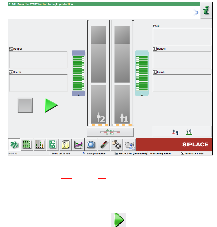 5 Feladatok a beültető automatán Üzemeltetési útmutató SIPLACE T X 5.3 A SIPLACE-gépsor bekapcsolása A 714.0 jelű szoftververziótól 2020.12 224 5 Ábra 5.3 - 1 A "Gyártás" nézet az állomásszoftver betöltése után…
