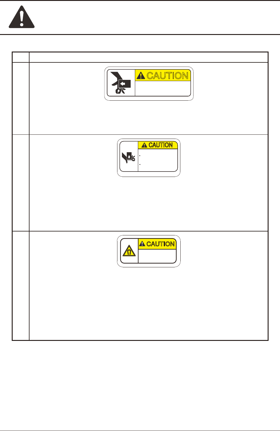 Safety Precautions Safe-26 1OM-1751 1305-002 5. Alert Labels No. Alert Labels and Description (7) CAUTION 10-0146- Do not let your finger get caught in this. An injury will result. Description When a covers (door type)…