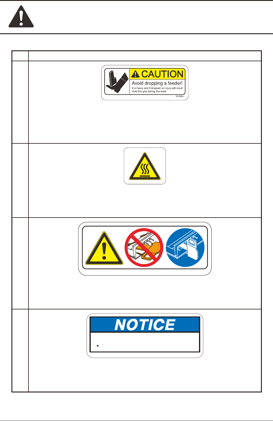 Safety Precautions Safe-29 1OM-1751 5. Alert Labels 1305-002 No. Alert Labels and Description (17) 10-0333- Never disconnect the connector during the feeder base lifting operation. Doing so might cause a sys t em mal f u…